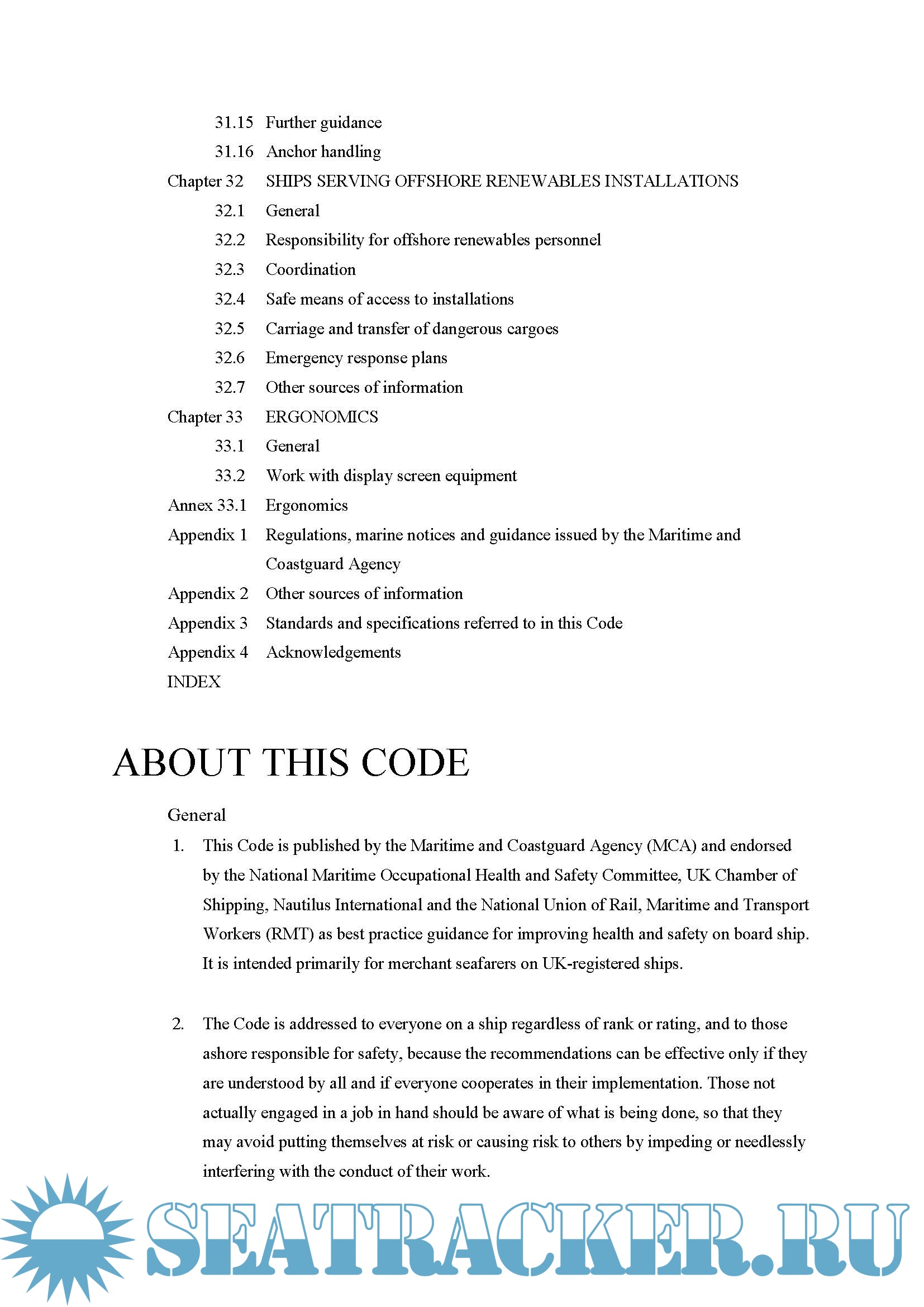Description: It is a statutory requirement that seafarers are provided with the information necessary to ensure their health and safety. The MCA considers that on UK ships this means that all those with specific responsibilities for safety should have immediate access to this Code, and that it should be readily available to all seafarers on board, e.g. a copy should be kept in the mess room. It should be provided in appropriate formats (e.g. electronic and hard copy) in sufficient quantity to ensure easy access. The Code should be supplemented by safety manuals, work instructions and other guidance issued by shipping companies for their particular ships, as appropriate.
