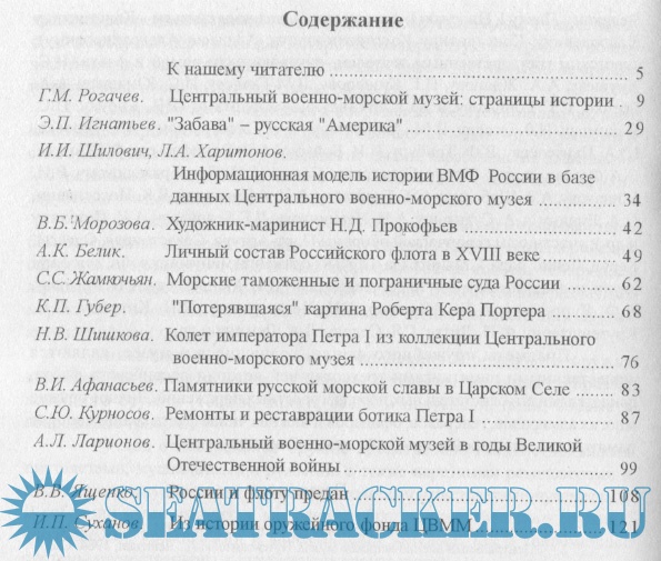 Описание: В статьях сотрудников ЦВММ, специалистов-историков рассказывается об этапах истории музея, о наиболее значительных экспонатах, являющихся национальными реликвиями, в частности, о предметах, относящихся к основателю музея — Петру Великому. Публикуются материалы по истории Российского флота, о связанных с ним людях, о компьютеризации музея.