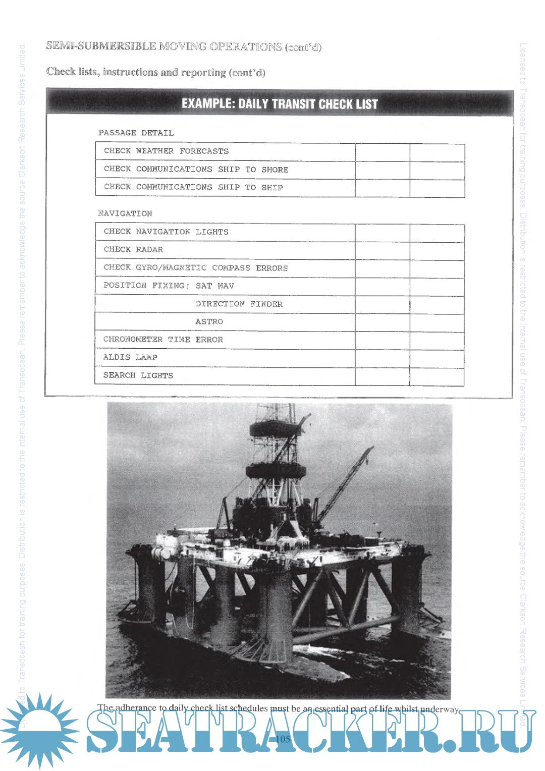 The command structure of semi-submersible vessels often follows a somewhat unusual pattern. In North Europe and the USA semi-submersible drilling units (especially those with propulsion systems) are usually under the command of a Master who holds a formal qualification and it is this individual who directs the operation (moving and mooring). He may be assisted by a Towmaster or Rig mover who may be an employee of the vessel’s owner or charterer.