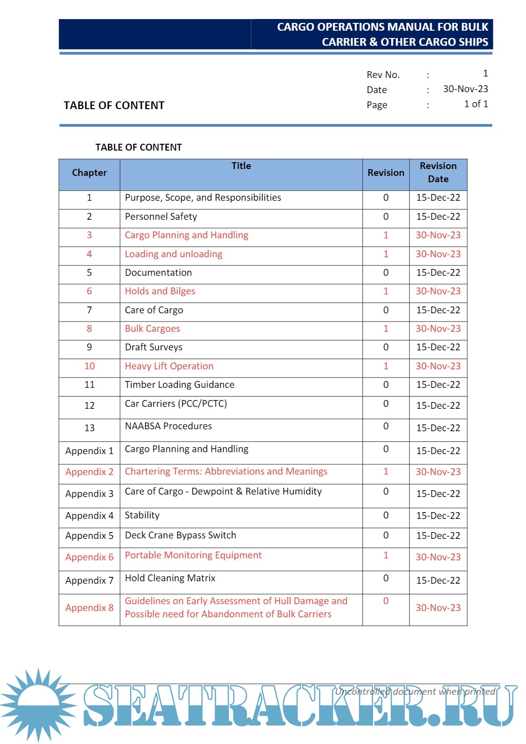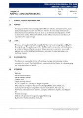 Description: The purpose of this manual is to guide the Master, Officers, and Crew to load, carry and unload cargoes in a safe and efficient manner. At every stage of the vessel’s operation due consideration must be given to all the rules and regulations of the Classification society, IMO codes (IMSBC, Grain, IMDG, CSS), SOLAS and National regulations for cargo carriage.