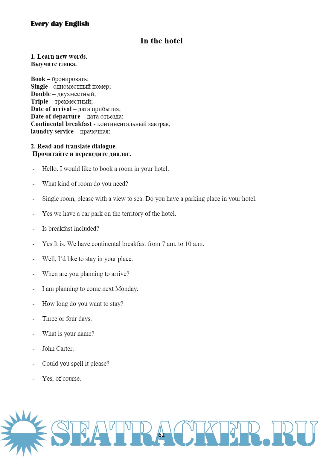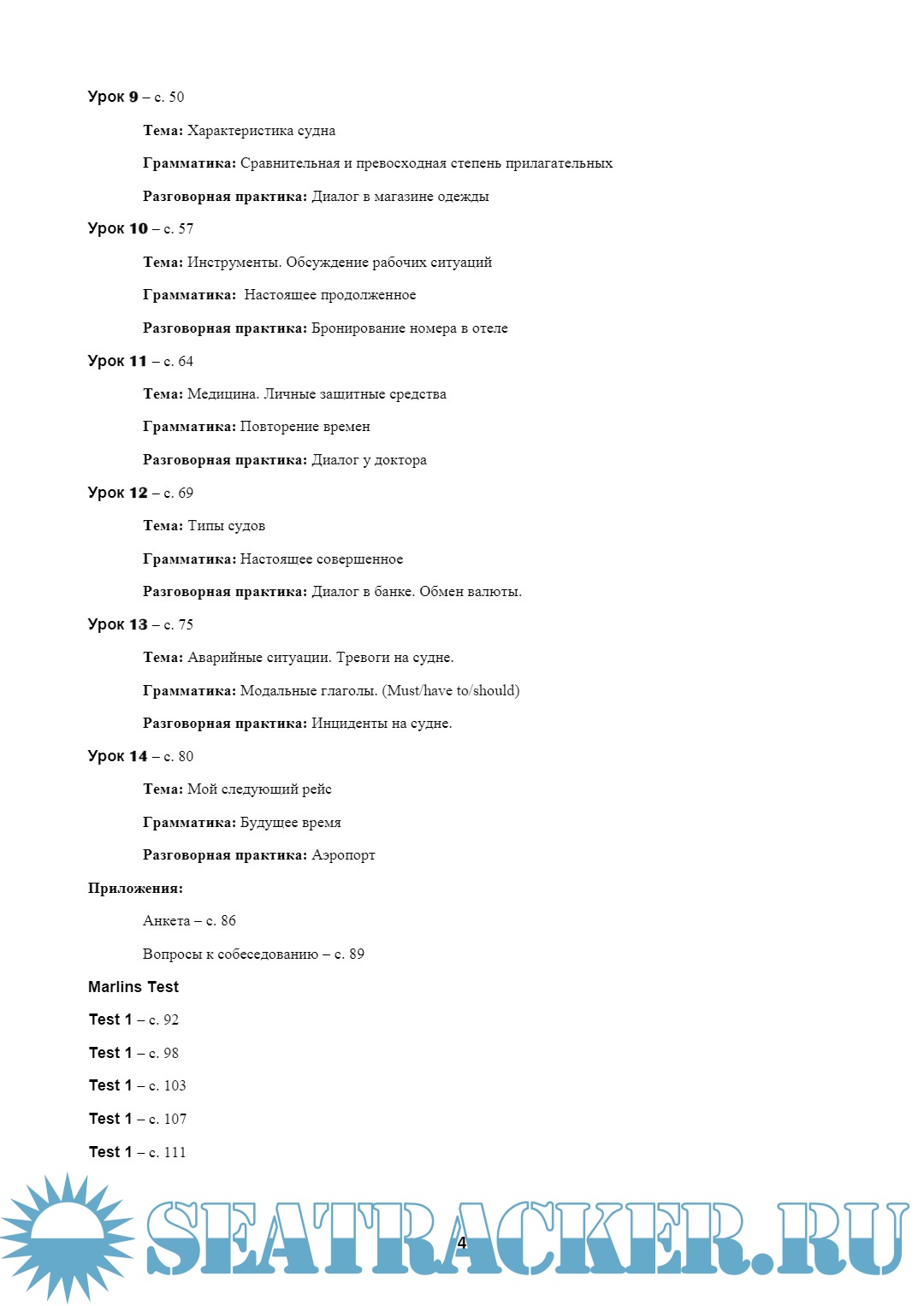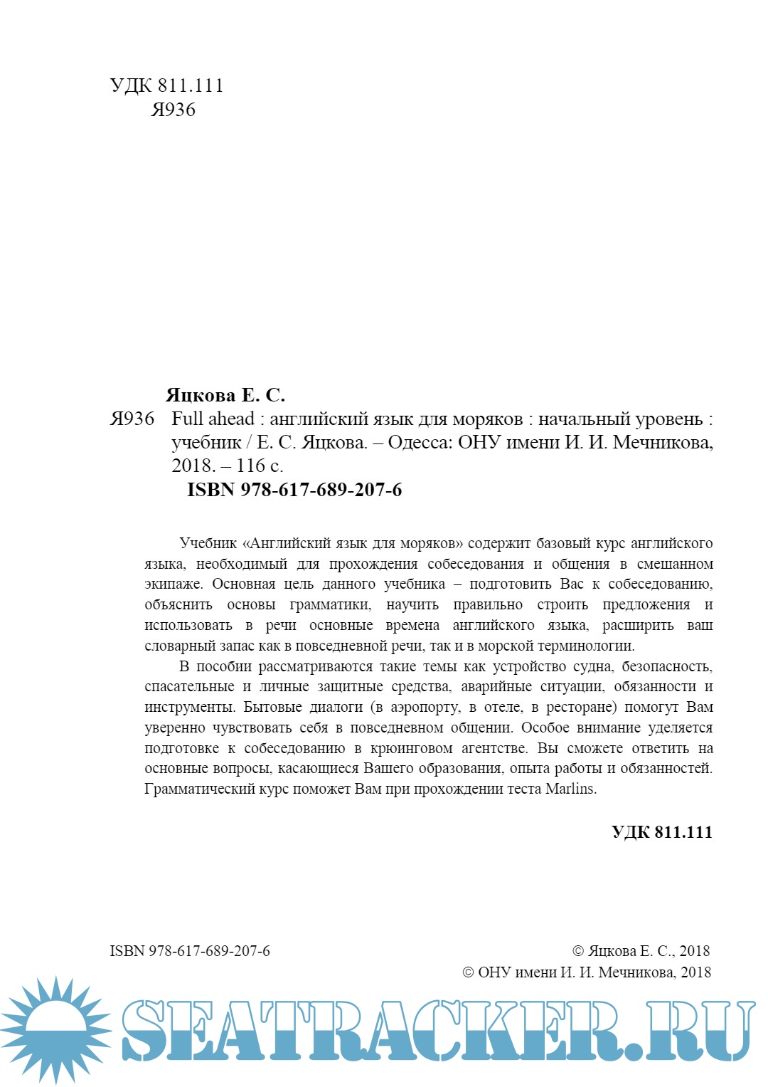 Год выпуска: 2018 Язык: Русский Автор: Е. С. Яцкова Жанр: Учебное пособие Издательство: ОНУ имени И. И. Мечникова ISBN: 978-617-689-207-6 Формат: PDF Качество: Изначально компьютерное (eBook) Количество страниц: 116 Описание: Учебник «Английский язык для моряков» содержит базовый курс английского языка, необходимый для прохождения собеседования и общения в смешанном экипаже. Основная цель данного учебника – подготовить Вас к собеседованию, объяснить основы грамматики, научить правильно строить предложения и использовать в речи основные времена английского языка, расширить ваш словарный запас как в повседневной речи, так и в морской терминологии. В пособии рассматриваются такие темы как устройство судна, безопасность, спасательные и личные защитные средства, аварийные ситуации, обязанности и инструменты. Бытовые диалоги (в аэропорту, в отеле, в ресторане) помогут Вам уверенно чувствовать себя в повседневном общении. Особое внимание уделяется подготовке к собеседованию в крюинговом агентстве. Вы сможете ответить на основные вопросы, касающиеся Вашего образования, опыта работы и обязанностей. Грамматический курс поможет Вам при прохождении теста Marlins.