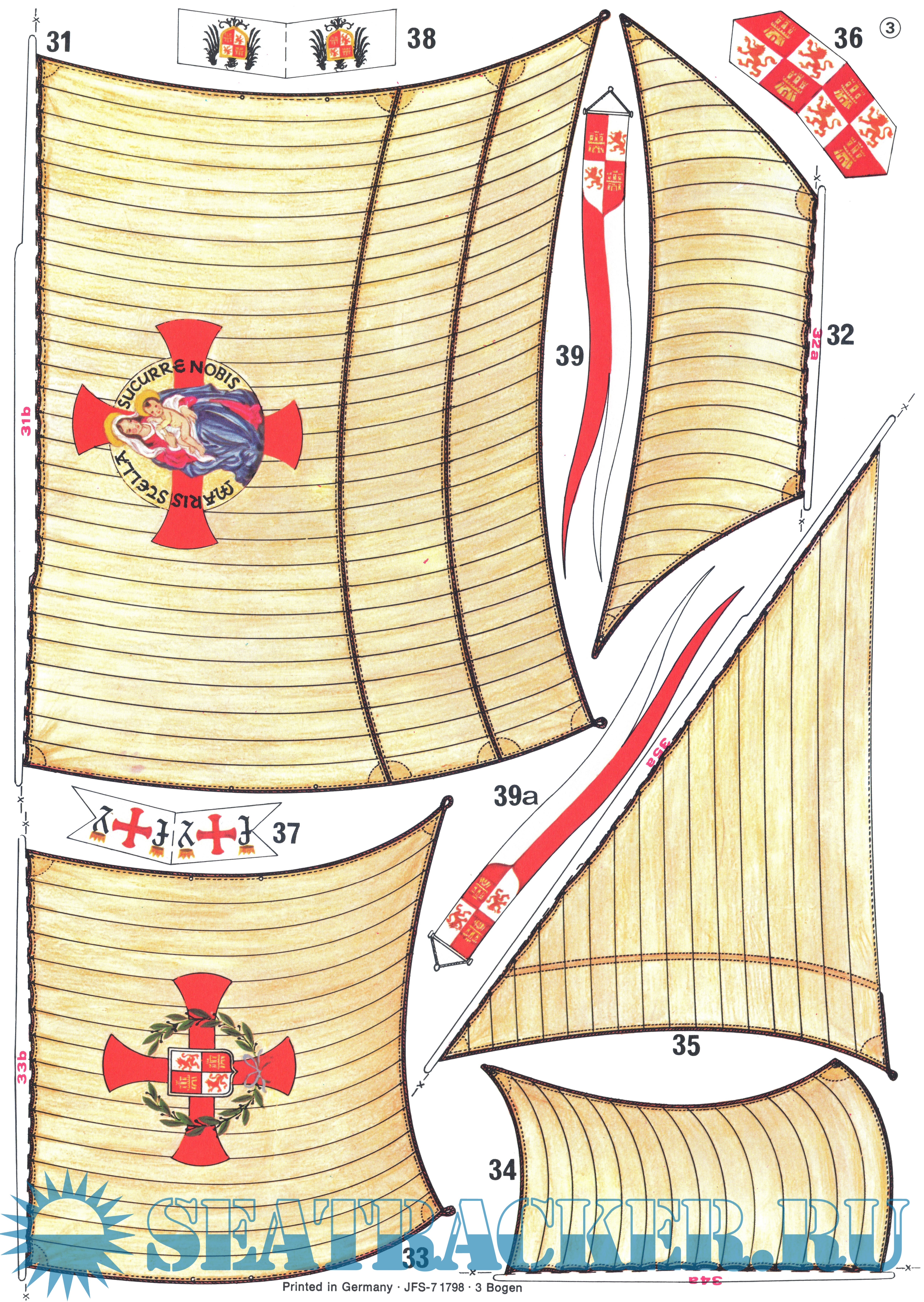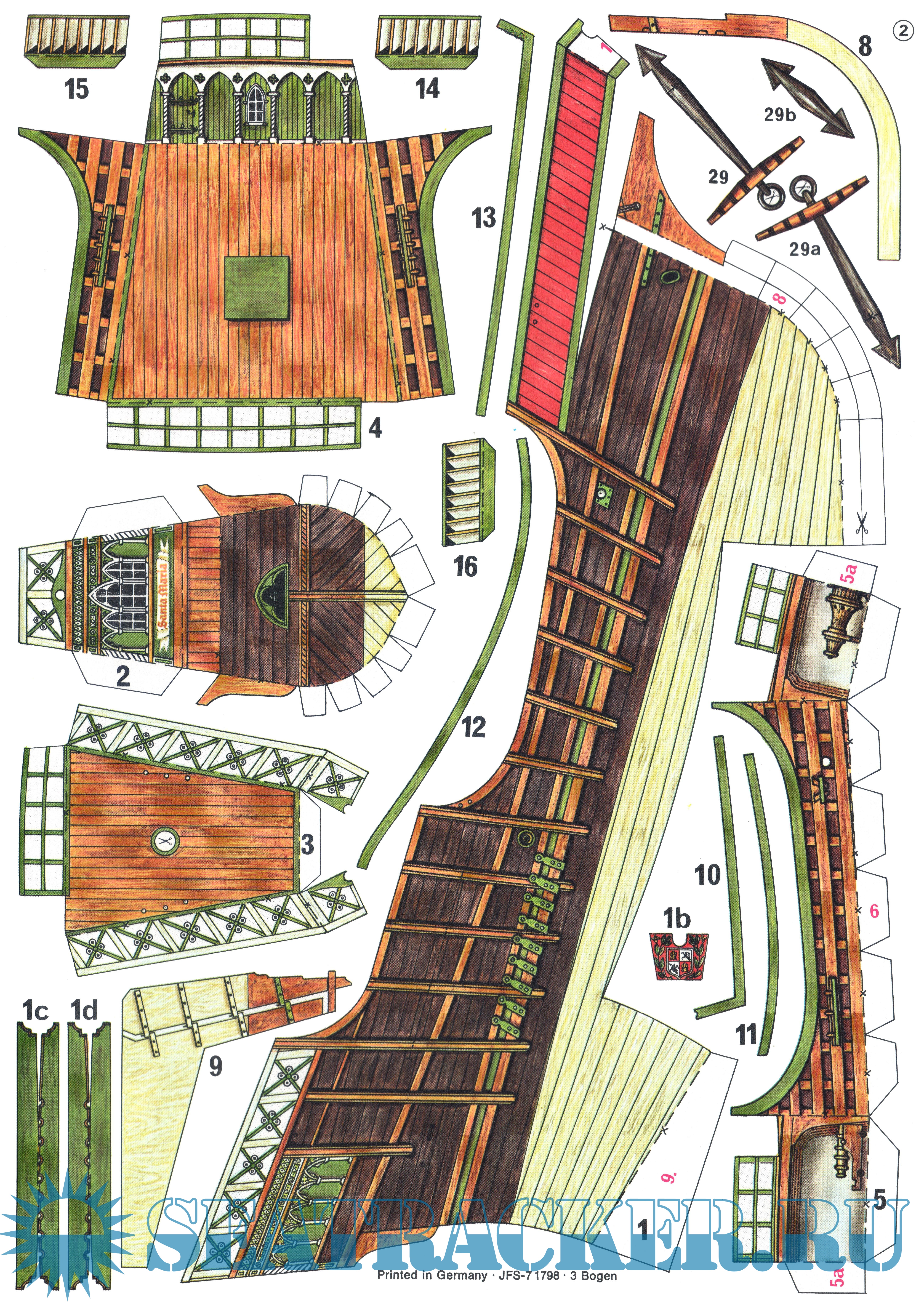 15 листов цветных выкроек и инструкций для изготовления бумажной модели флагманского парусного корабля Колумба ''Santa Maria'' 1492 год в масштабе 1:100