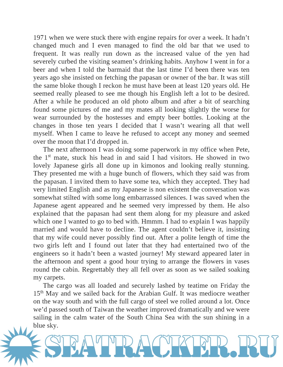 This volume is the second of Bob’s memoirs covering his service as master on a wide variety of ships. The first book ‘I think I’ll go to sea’ relates to his experiences climbing up through the ranks. In this book he has to flee the USA to avoid arrest for drug smuggling, assists rescuing a ship’s crew when their ship sinks in pack ice and gets stuck in the middle of the Iraq/Iran war. He also experiences alcohol free ships which take away the pleasure of his ‘cold beer’
