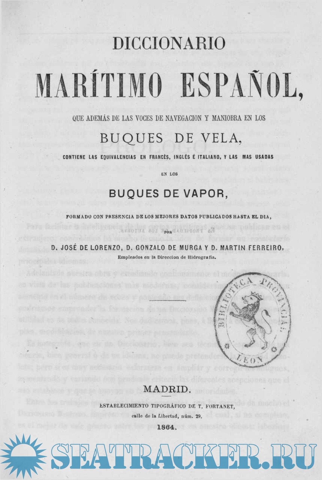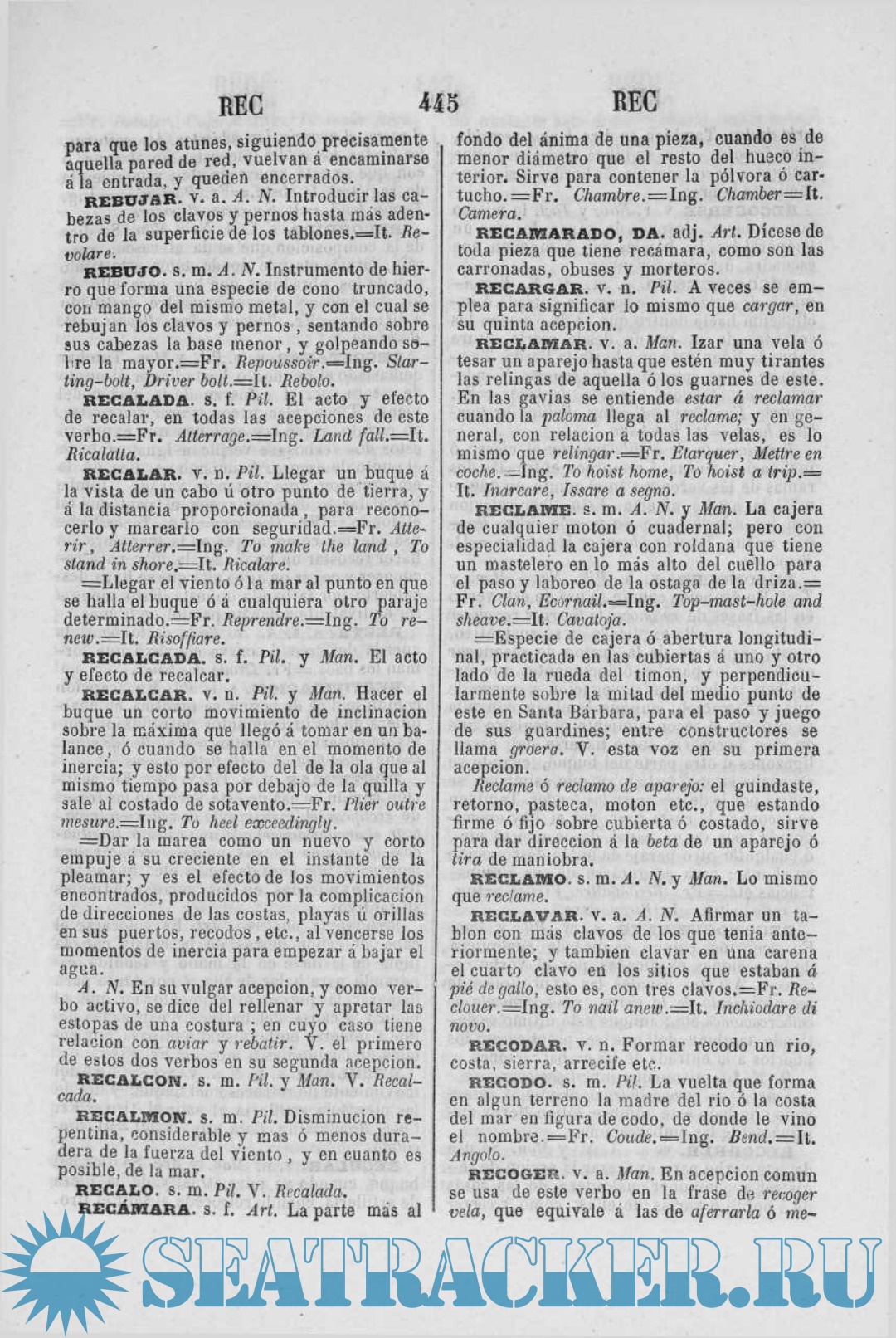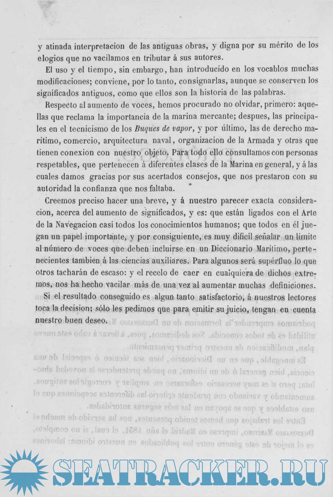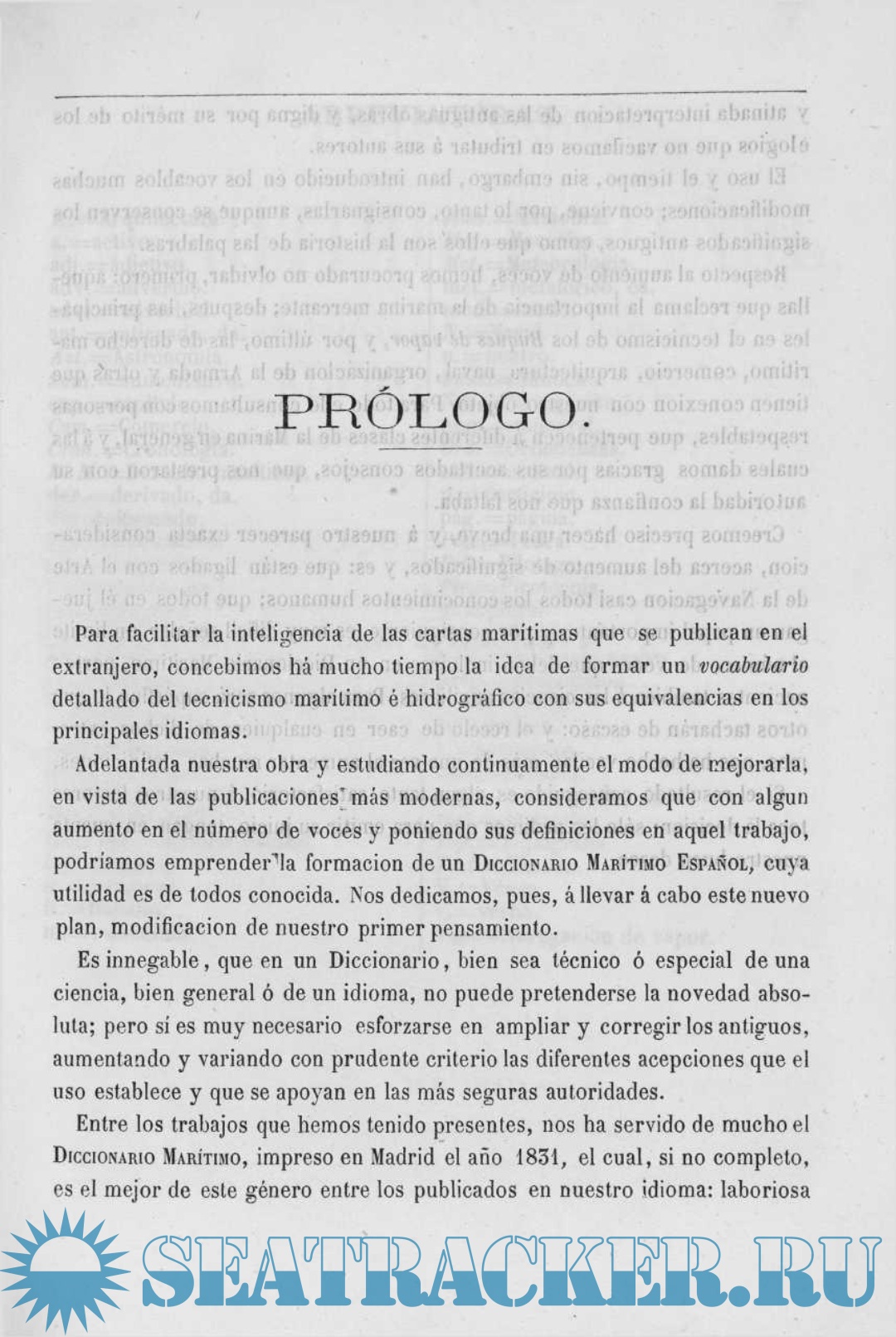 Entre los trabajos que hemos tenido presentes, nos ha servido de mucho el DICCIONARIO MARÍTIMO, impreso en Madrid el año 1831, el cual, si no completo, es el mejor de este género entre los publicados en nuestro idioma: laboriosa y atinada interpretación de las antiguas obras, y digna por su mérito de los elogios que no vacilamos en tributar á sus autores.