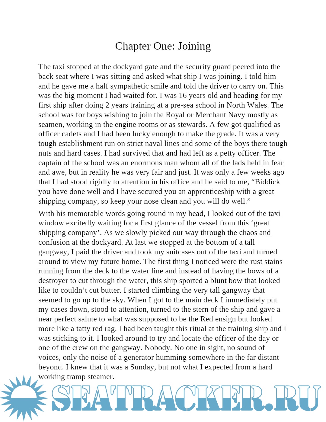 Year: 2017 Language: English Author: Peter Biddick Genre: Other Edition: Kindle Format: PDF Quality: eBook Pages count: 125 Description: Peter Biddick left home at the age of fourteen to attend a pre-sea training ship in North Wales with his sights set on a career in the Merchant Navy. This story shares his experiences from joining his first ship as a cadet at the tender age of sixteen to working up through the ranks eventually sailing as 2nd mate on passenger cargo ships. Discover what life was like during the Merchant shipping heyday showcasing the hardships, excitements and fun whilst tramping about the world. From the Author - This story is about my sea going career, starting off as an impressionable cadet at the tender age of 16 in 1958. It is based on fact with a few added touches of fiction. I have never regretted going to sea and many a time in a difficult situation I will ask myself, what would have I have done when I was in the Navy and usually get a reasonable answer. I consider myself a fortunate person to be able to recall some of those events that remain in my memory. Anyone that has spent a significant amount of time at sea will always have the taste of salt in their veins. The love, fear and respect produced from being surrounded by a vast expanse of ocean will stay with me forever.