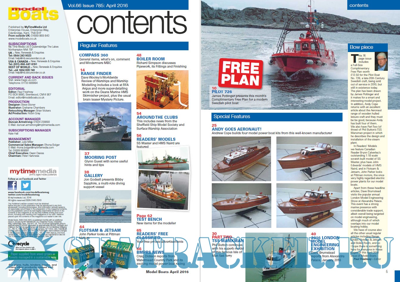 Description: Model Boats magazine is a practical and informative read for those with a love for the hobby. It covers the latest news and views from the various clubs and associations around the country, useful hints, tips and step by step guides for those interested in the art of constructing a model boat as well as tests and recommendations of new boats and tools. Floating along behind these are great special features examining in depth different models from narrowboat to destroyer!
