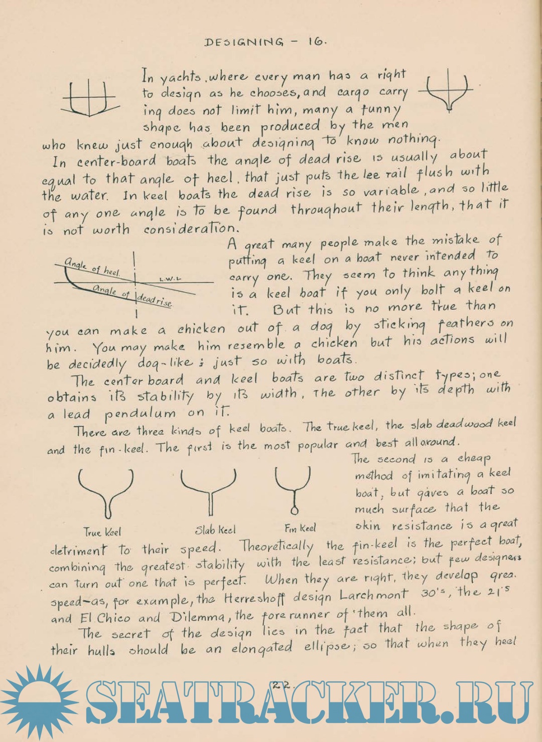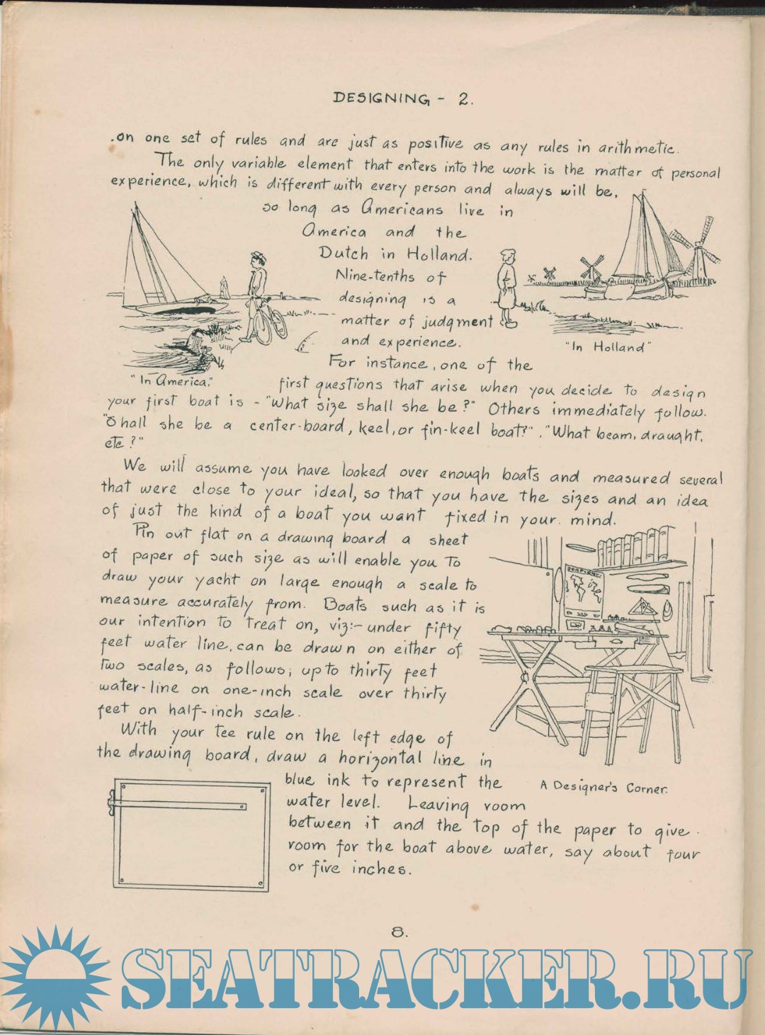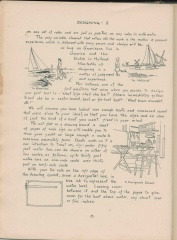 How to Design a Yacht is fully illustrated with Mr. Davis’s technically precise drawings and lively pen-and-ink sketches of the boats he loves. Nearly every page displays several ink drawings illustrating the text. He gives a friendly explanation of how to design a beautiful boat for yourself, how to balance a flowing sheerline and includes drawings of the relative heights of the bow and stern on different vessel types. He writes, "From the simple little plumb-ended cat-boat to the elaborate steam yacht there is a certain harmony of proportions and angles for each that can make a complete-looking, tidy little craft, or a great ugly-looking unfinished appearing one.”