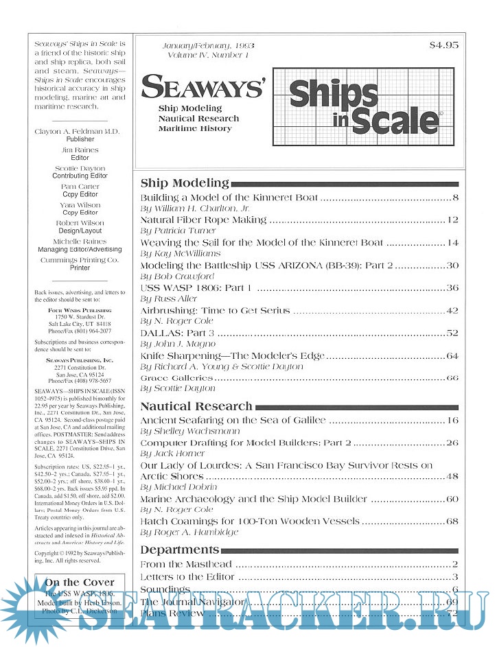 Year: 1993 Language: English Author: Scottie Dayton (Editor) Genre: Periodical (magazine) Edition: 1993-1 Format: PDF Quality: eBook Pages count: 76 Description: Seaway is the home port for Seaways Ships in Scale magazine, the leading workshop and research magazine for the ship modeler. In the magazine we explore all levels of modeling experience, all types of ships, all kinds of models, all historical eras and all construction materials
