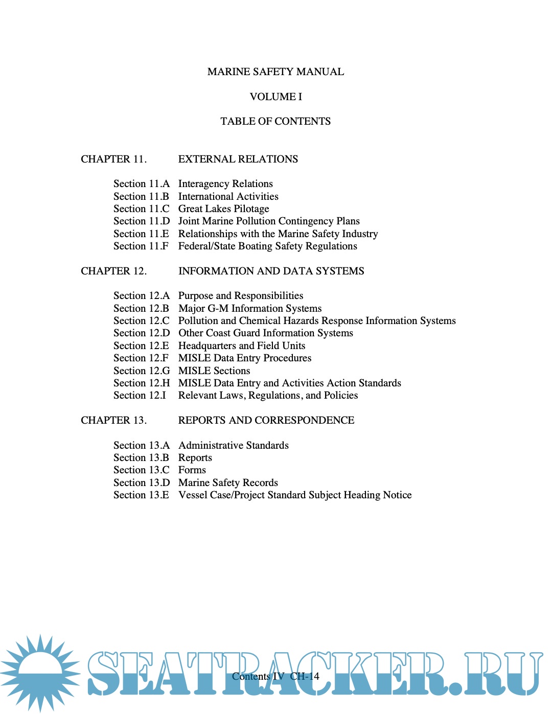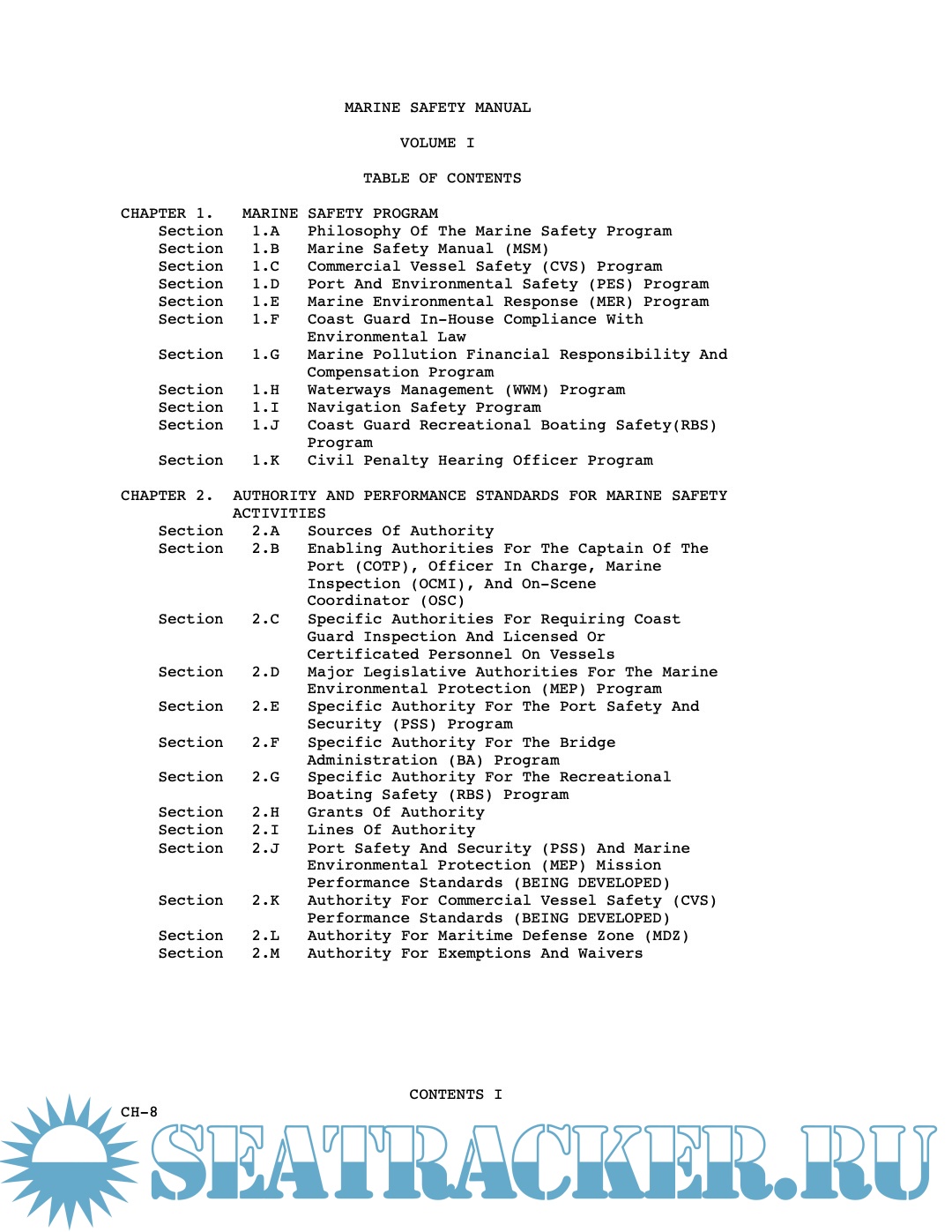 Year: 2012 Language: English Author: P.F. Thomas Genre: Manual Publisher: USCG Format: PDF Quality: eBook Pages count: 500 Description: The MSM is the primary policy and procedural statement for the marine safety programs of the Coast Guard. Published for the use of all Coast industry personnel, it prescribes the essential functions which must be performed to attain the overall objectives of the CVS and PES/MER/WWM Programs and certain investigative functions of the RBS Program. The MSM should be used as a guide for consistent and uniform administration of marine safety activities, without undue hampering of independent action and judgment by marine safety personnel.