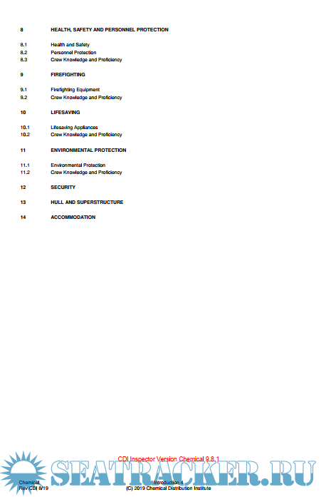 Year: 2019 Language: english Author: Chimical Distribution Institution Genre: Documentation Publisher: CDI-Marine Edition: 2019 Format: PDF Quality: eBook Pages count: 162 Description: CDI-Marine 9th Edition Ship Inspection Report (SIR) Launch 2nd September 2019 The launch of the CDI 9th Edition Ship Inspection Report (SIR) is planned to for the 2nd September 2019: This is the scheduled go-live date and from the 2nd September 2019 any CDI inspection request will only be conducted under the 9th edition SIR. A PDF version of the new 9th edition SIR (Version 9.8.1 Gas SIR and Version 9.8.1 Chemical SIR) will be available to download from the CDI download page at www.cdim.org from the 1st April 2019 The new 9th edition SIR will be launched on the 2nd September 2019 Downloaded PDF versions of the 9th editions SIR will be water marked with your email address, in order to control the document and personalise the questionnaire. In order to ensure further document control, Excel versions of the 9th edition will only be made available to Chemical Company participants of CDI. (This will be upon request) Transition of the 8th SIR edition to 9th edition SIR Prior to the 2nd September 2019 CDI inspectors will be emailed instructions regarding the new 9th edition online inspector software All inspection requests which have an appointed inspector prior to the 2nd September 2019 can be conducted under the 8th edition SIR with the existing CDI ISIS inspector software, (even if the inspection takes place after the 2nd September 2019), as long as them inspector has downloaded a blank 8th edition SIR report for the ship before the 2nd of September 2019. CDI inspectors appointed by a ship operator prior to the 2nd September 2019 will only be able to download a blank 8th edition SIR from CDI with the existing CDI inspector software, (or alternatively they must wait until the 2nd of September to download a blank 9th edition report with the new CDI ISIS inspector online software). After the 2nd September 2019 All inspection requests received by CDI from the 2nd September 2019 will only be processed as a 9th edition SIR. CDI inspectors nominated by a ship operator after the 2nd September 2019 will only be able to download a blank 9th edition SIR from CDI with the new CDI ISIS 9th edition inspector online software. Inspector downloaded 8th edition SIR (downloaded before the 2nd September 2019), but which complete inspection after the 2nd September 2019 can continue to be uploaded into the CDI ISIS database with the old 8th edition software, in the usual manner without restriction. Reminder regarding the Self-Inspection process. All CDI ships will continue to be eligible to complete the Self Inspection question sets from in the 9th edition SIR. However, in view of the new 9th edition SIR a revised Online Self Inspection Document (Online SID), will also be released closer to the launch date All SI (Self-inspection Questions) will continue to be indicated in the 9th edition SIR by SI All the Inspection Questions will continue to be indicated in the 9th edition SIR by I All the Self-Inspection Questions will continue to be available in a free online web application known as the Online Self Inspection Document (Online SID). This will be available to access on the CDI web site free of charge a few weeks prior to the 2nd September 2019. The ship operator will continue to be able to electronically complete the SID at any time and provide this to the CDI inspector in advance of the inspection, who will then import the fully completed online SID into his inspection report. The CDI Inspector will continue to randomly sample 15% of the SI questions during his inspection. Where an Inspector finds that the 15% random sample of SI questions have not been answered correctly, the Inspection will revert to a full inspection of the ship. Therefore, Ships operators should not only complete a SID prior to the CDI inspection but ensure the SID is completed accurately as doing so will be hugely beneficial to the ship operator and the inspection process It will be the responsibility of the Ship Operator to ensure that the Self-Inspection Document (SID) is provided to the Inspector prior to the inspection. Failure to provide a SID to the inspector will always result in a full inspection.
