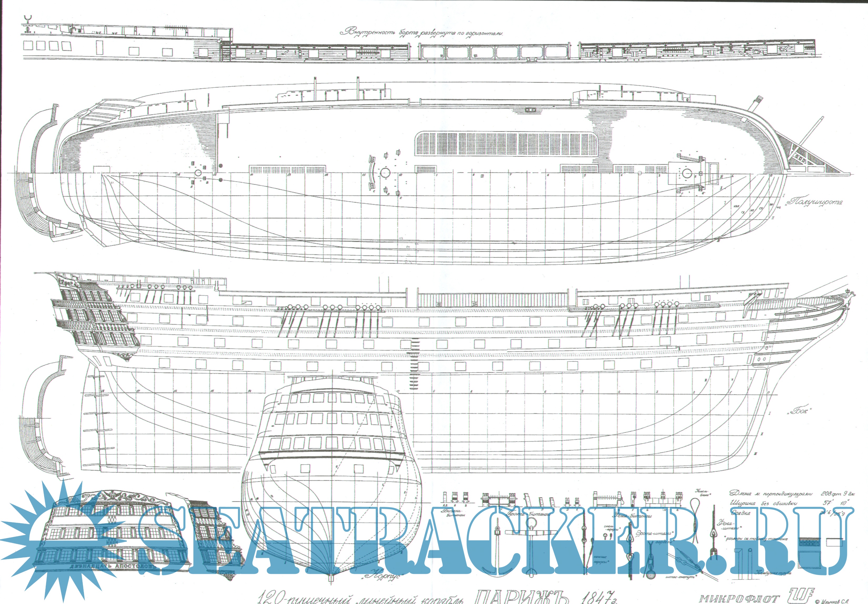 Описание: Чертежи 120-пушечного русского линейного парусного корабля "Париж" 1849 год в масштабе 1:200