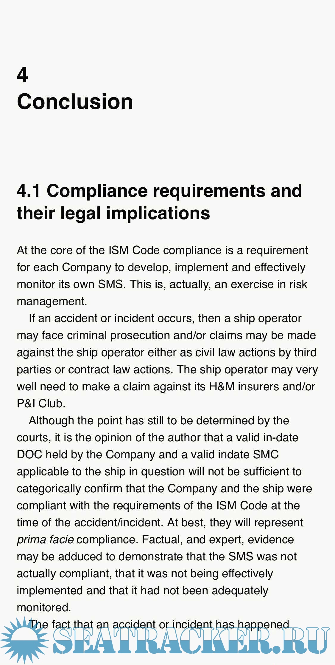 The ISM Code has been mandatory for almost every commercial vessel in the world for more than a decade and nearly two decades for high risk vessels, yet there is very little case law in this area. Consequently, there remains a great deal of confusion about the potential legal and insurance implications of the Code.
