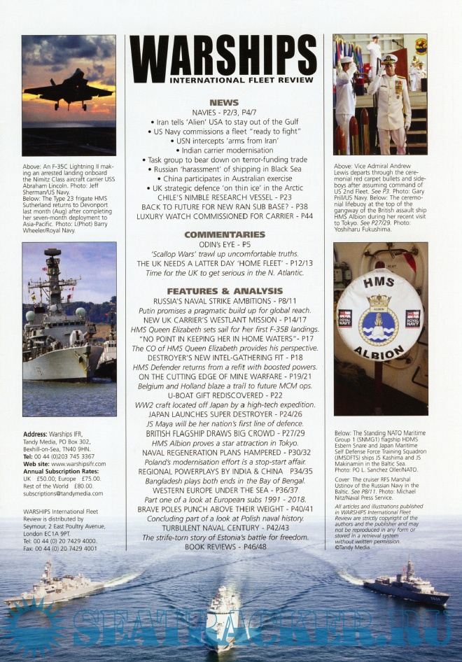 Year: 2018 Language: English Author: Iain Ballantyne (Editor) Genre: Periodical (magazine) Edition: 2018-10 Format: PDF Quality: eBook Pages count: 44 Description: Warships IFR puts the spotlight on the latest developments in the world’s navies. It covers current defence issues and has comments by leading analysts. The magazine regularly includes features on the Royal Navy and the US Navy in addition to incorporating news and features on all other navies across the globe. Warships IFR frequently carries in-depth articles on naval heritage.WARSHIPS International Fleet Review is published 12 times a year by Tandy Media Ltd who also publish Shipping Today & Yesterday (which provides news and features from the world of merchant shipping).