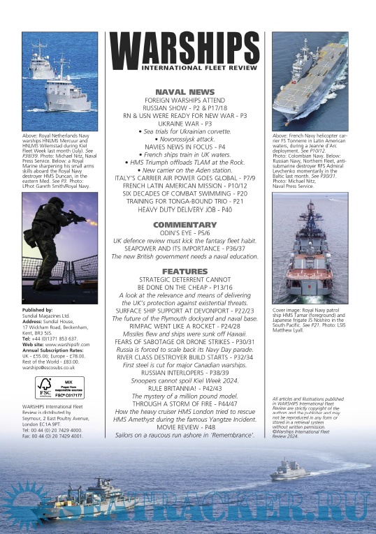 Year: 2024 Language: English Author: Iain Ballantyne (Editor) Genre: Periodical publication Edition: 2024-09 Format: PDF Quality: eBook Pages count: 52 Description: Warships IFR puts the spotlight on the latest developments in the world’s navies. It covers current defence issues and has comments by leading analysts. The magazine regularly includes features on the Royal Navy and the US Navy in addition to incorporating news and features on all other navies across the globe. Warships IFR frequently carries in-depth articles on naval heritage.WARSHIPS International Fleet Review is published 12 times a year by Tandy Media Ltd who also publish Shipping Today & Yesterday (which provides news and features from the world of merchant shipping).