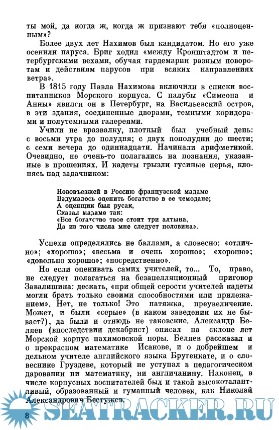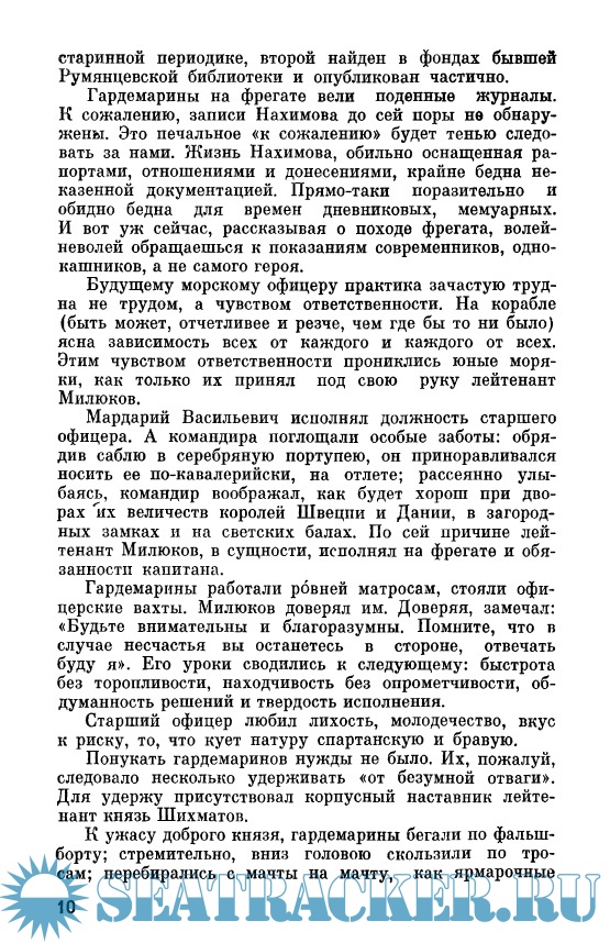 Год выпуска: 1970 Язык: Русский Автор: Давыдов Ю.В. Жанр: Историческое Издательство: Молодая гвардия Издание: ЖЗЛ Формат: PDF Качество: Отсканированные страницы Количество страниц: 187 Описание: На флоте говорят кратко: «Дальность видимости». Подразумевается: «Геометрическая (географическая) дальность визуальной видимости предметов». В формуле - «е» суть высота глаз наблюдателя, «h» - высота наблюдаемого предмета. Произведи несложные действия, получишь расстояние в милях. Все просто, когда б не добавка: «При дымке, тумане, дожде, снегопаде дальность видимости может значительно понижаться»... Величие Нахимова не внешнее, не фразистое, не броское. Оно полновесное, остойчивое, с крепким килем. И потому Нахимов не нуждается ни в "чистке сапог", ни в "медвежьей шапке".