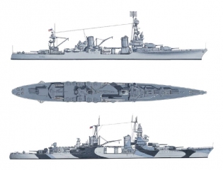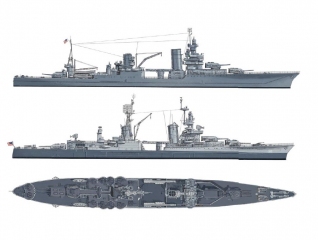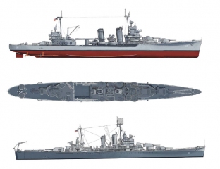 Description: Designed and produced under the regulations of the Washington Naval Treaty, the heavy cruisers of the Pensacola, Northampton, Portland, New Orleans and Wichita classes were exercises in compromise. While they possessed very heavy armament – the Pensacolas, for example, carrying a main battery of ten 8” guns – this came at the cost of protection – armor was the same thickness as a gun cruiser, and incapable of protecting the vessels from enemy 8” fire. As the classes evolved, these flaws began to be corrected, with the main battery being reduced, and increased protection being added to the vital areas of the ship. Despite these drawbacks, the pre-war heavy cruiser classes served with distinction throughout World War II.