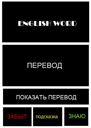 Режимы работы: 2 режима -обучение (без ограничений) -контрольный тест (25 слов) Отличие режимов в том ,что в контрольном тесте кнопки подсказка и показать перевод можно нажимать только 3 раза Функционал: При клике по кнопке подсказка показывать случайные 2 буквы перевода, если еще раз нажать, то еще 2 буквы... При клике по кнопке Знаю больше не выдавать это слово в режиме обучения При успешном прохождении контрольного теста в следующий раз уже не выдавать те слова, которые были в прошлом тесте У меня к сожалению не хватает мозгов такое сделать. Пробовал через онлайн конструкторы, но никак