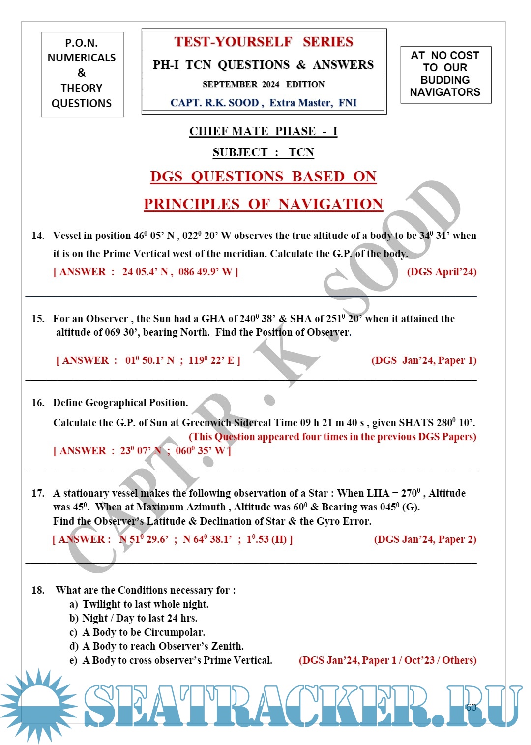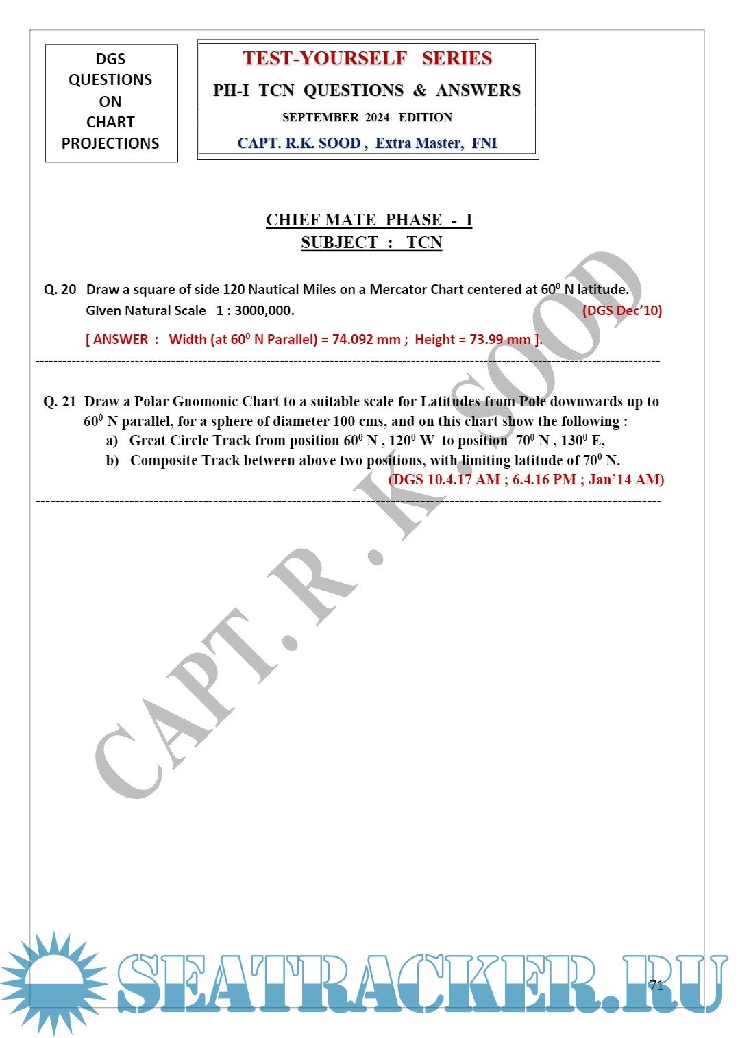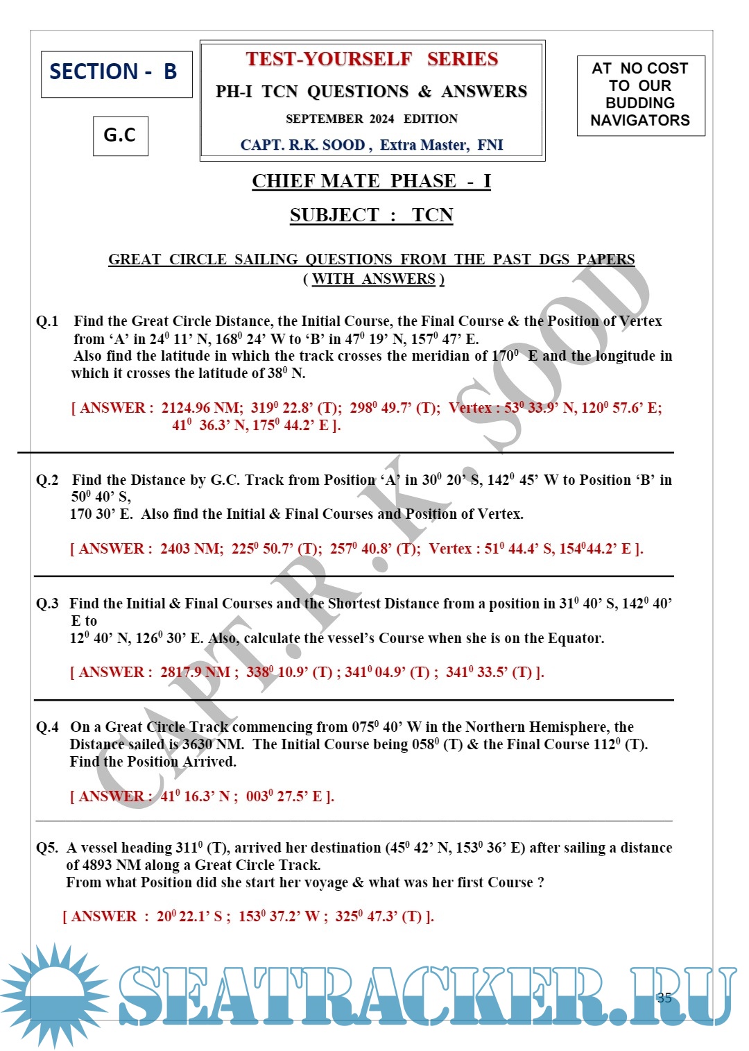 Year: 2024 Language: English Author: Capt. R.K. Sood Genre: Answers (cheat sheets) Edition: 5th | September Format: PDF Quality: eBook Pages count: 73 Description: From the author: This is the Revised (September 2024) Edition of TCN ‘TEST YOURSELF SERIES’ with few more Questions added, Typos removed (I am a one-finger typist !) & Corrections made, where necessary, to the previous edition of June’24. This ‘TEST YOURSELF SERIES’ is made in the same Pattern & format as the DGS Competency Examination Question Paper of TERRESSTRIAL & CELESTIAL NAVIGATION’ (TCN) Subject for Chief Mate Phase-I (FG) Syllabus ( i.e. consisting of Sections ‘A’ ‘B’ & ‘C’ covering individual topics). TCN is somewhat a challenging, but manageable Subject, requiring dedicated & focused studies with lot of practice, as , EFFICIENT ‘time -management’ in cracking this Paper is of utmost importance. Additional info: About the author: (Ex Principal FOSMA New Delhi & FOSMA NOIDA). 30 Years of Teaching Experience in D.G.S. approved Post-Sea Maritime Institutes. Over 23 Years of Sailing Experience on Foreign-Going Ships, including 14 Years as Master. Now, teaching as an EXPERT / SPECIALIST Faculty in A.R.I. , New Delhi.