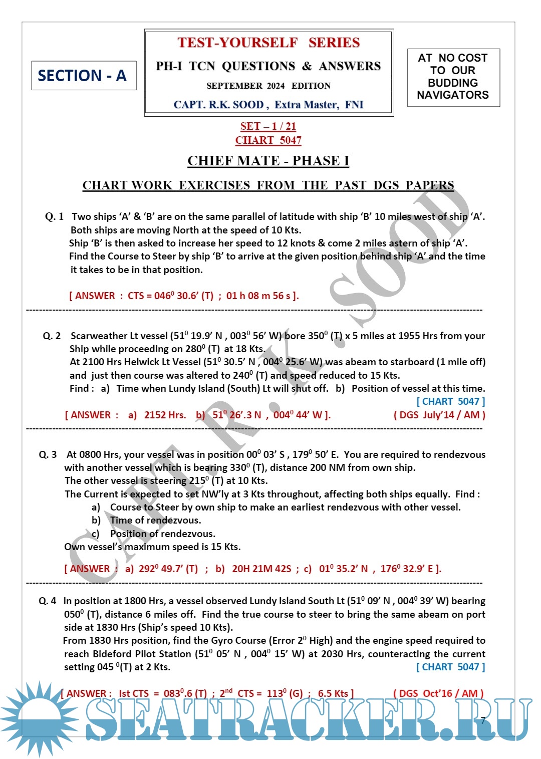 This ‘TEST YOURSELF SERIES’ is made in the same Pattern & format as the DGS Competency Examination Question Paper of TERRESSTRIAL & CELESTIAL NAVIGATION’ (TCN) Subject for Chief Mate Phase-I (FG) Syllabus ( i.e. consisting of Sections ‘A’ ‘B’ & ‘C’ covering individual topics).
