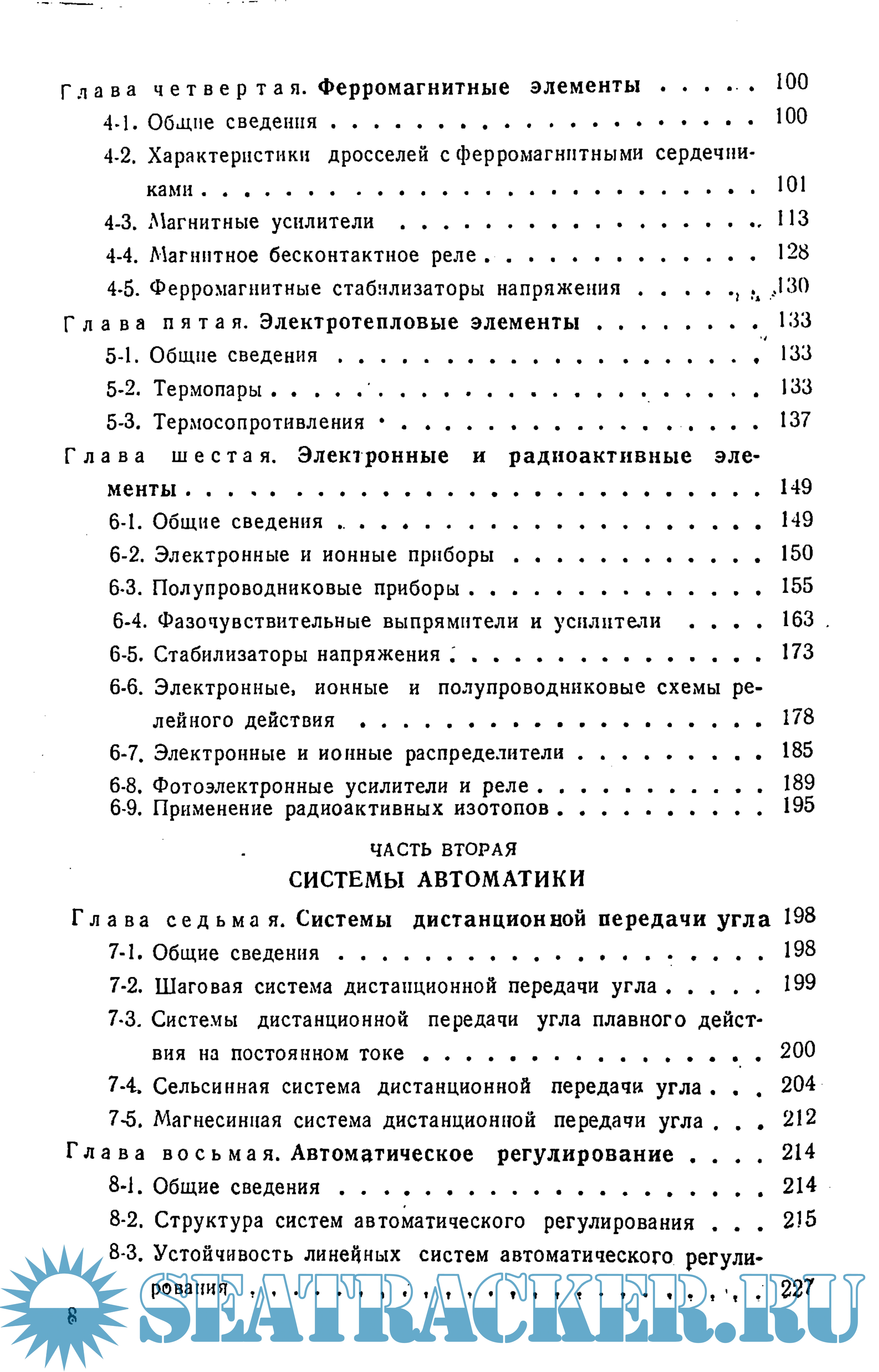 Во второй части книги рассматриваются системы автоматики. а именно: системы дистанционной передачи угла, системы автоматического регулирования и управления, следящде системы и измерительные системы. В гл. 8 и 9, помимо рассмотрения структуры и примеров систем автоматического регулирования и следящих систем, даны основы анализа устойчивости, для того чтобы облегчить понимание сложных вопросов динамики этих систем.