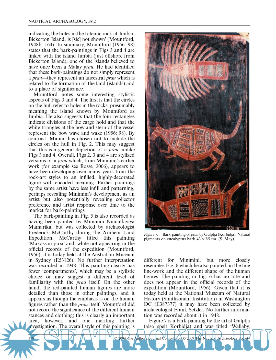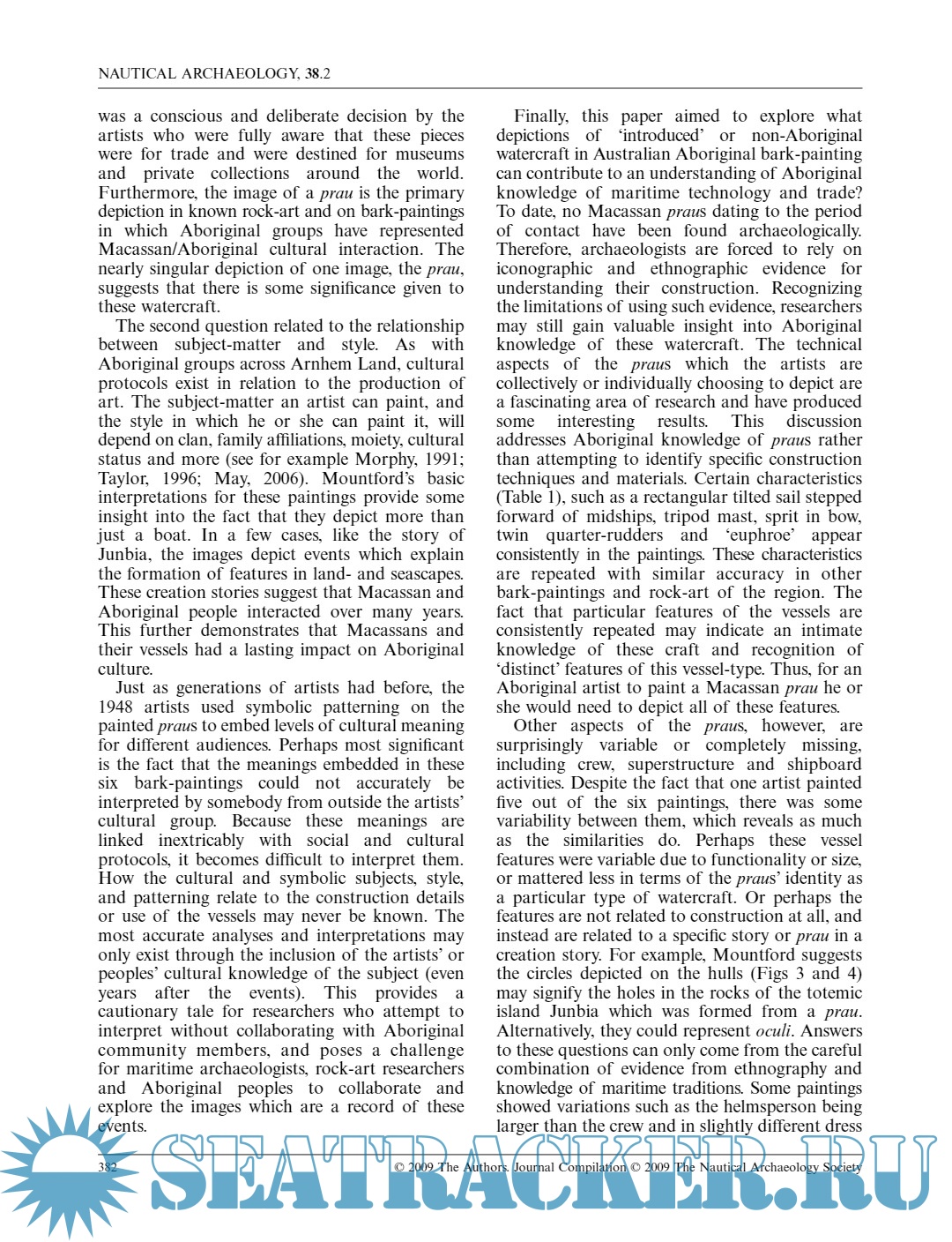 Year: 2009 Language: English Author: Sally K. May; Jennifer F. McKinnon; Jason T. Raupp Genre: Art, Historical, Art Format: PDF Quality: eBook Pages count: 17 Description: This paper examines a group of Aboriginal bark-paintings featuring Macassan praus that were collected in 1948 during the American-Australian Scientific Expedition to Arnhem Land. These paintings were studied in an effort to understand issues related to Aboriginal and Macassan cross-cultural interaction, stylistic adaptation and change, and maritime technologies. Furthermore, it is one example in which the collaborative efforts of maritime and Indigenous archaeologies can achieve a more holistic technological and stylistic cross-analysis of watercraft imagery.