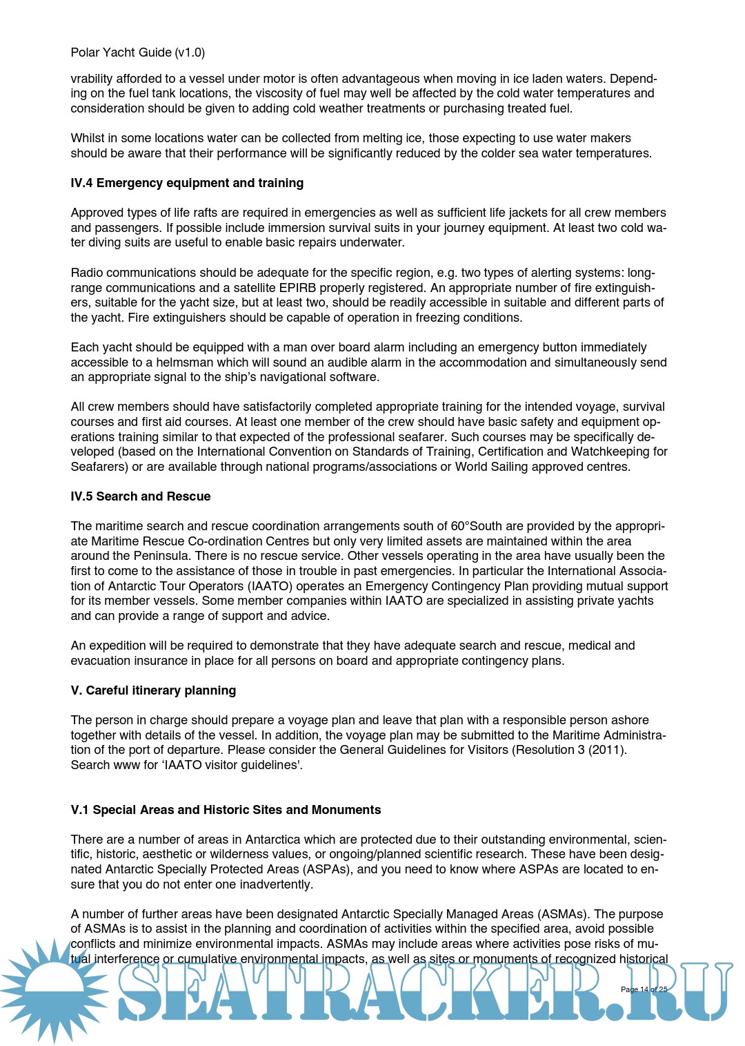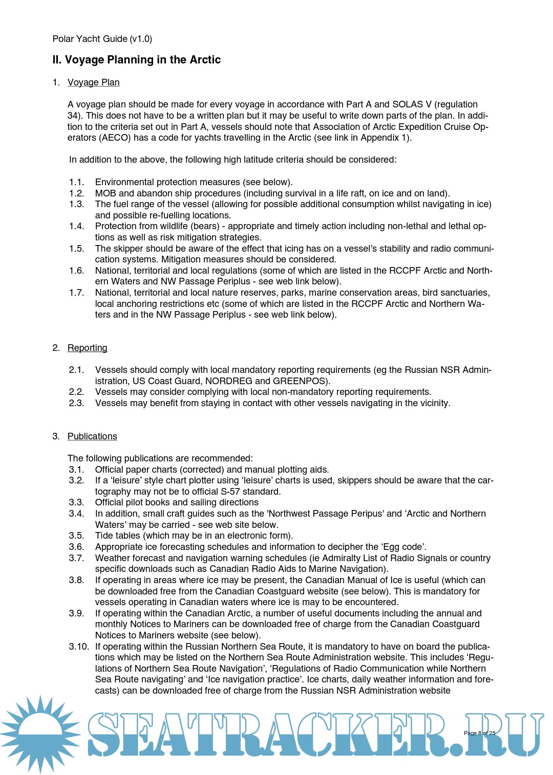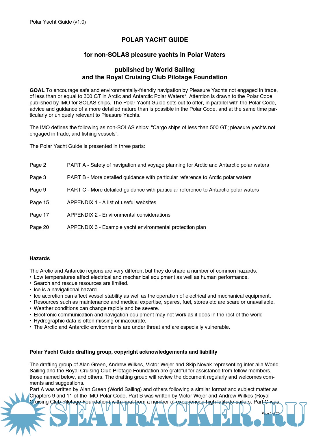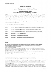 Description: GOAL To encourage safe and environmentally-friendly navigation by Pleasure Yachts not engaged in trade, of less than or equal to 300 GT in Arctic and Antarctic Polar Waters*. Attention is drawn to the Polar Code published by IMO for SOLAS ships. The Polar Yacht Guide sets out to offer, in parallel with the Polar Code, advice and guidance of a more detailed nature than is possible in the Polar Code, and at the same time particularly or uniquely relevant to Pleasure Yachts.