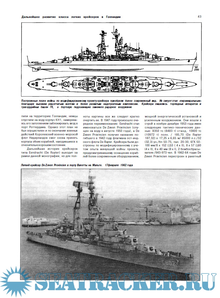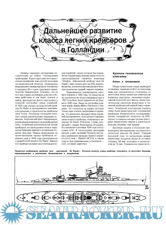 Описание: Возможно, название «колониальный крейсер» у многих ассоциируется с чем-то экзотическим вроде вооруженной гарпунами прогулочной яхты или, максимум, со сторожевиком с мелкокалиберной артиллерией. На деле же, колониальные крейсера Нидерландов мало в чем уступали аналогам своего класса из состава флотов ведущих морских держав. Однако в процессе работы не раз приходилось слышать, что у голландцев, мол, «небоевые корабли», которые ничем себя не проявили. Хочется возразить этим непререкаемым «авторитетам», с томным придыханием вспоминающим о потопленном в первом же боевом походе линкоре Bismarck и пугалом проторчавшем всю войну в норвежских шхерах Tirpitz, что так можно договориться до признания «небоевым» всего советского надводного флота, не имевшего ни одного боевого соприкосновения на уровне выше эсминцев противника и исполнявшего почти исключительно задачи огневой поддержки войск и транспортно-снабженческие функции.
