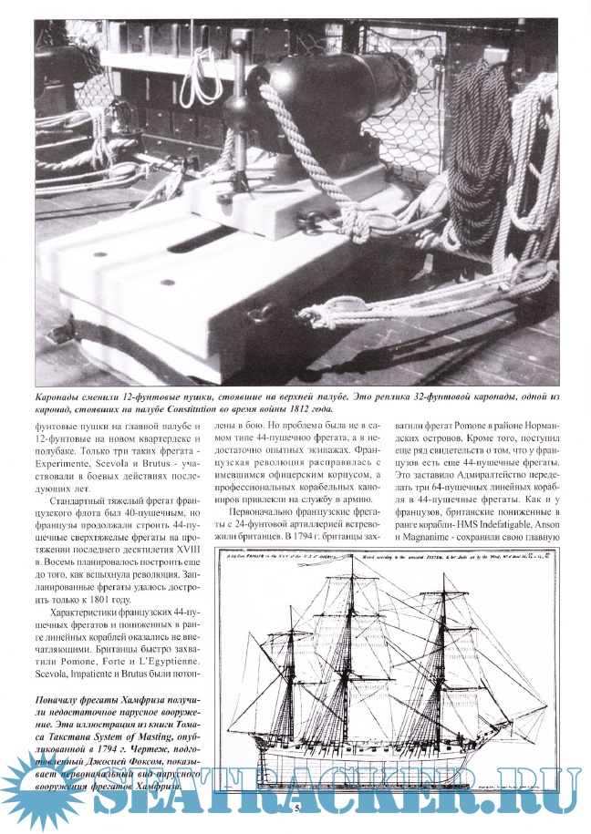Описание: В наши дни принято представлять фрегат как 44-пушечный корабль с главной батареей из тяжелых 24-фунтовых пушек. Авторы авантюрных романов любят помещать своих героев на палубу 44-пушечного французского или американского фрегата. Это беллетристика, но под ней есть определенное основание. Последний, сохранившийся до нас американский фрегат, был USS Constitution, принадлежавший именно к классу 44-пушечных фрегатов. Наиболее известный британский фрегат эпохи Наполеоновских войн - HMS Indefatigable - был одним из немногих британских фрегатов с 24-фунтовыми пушками.