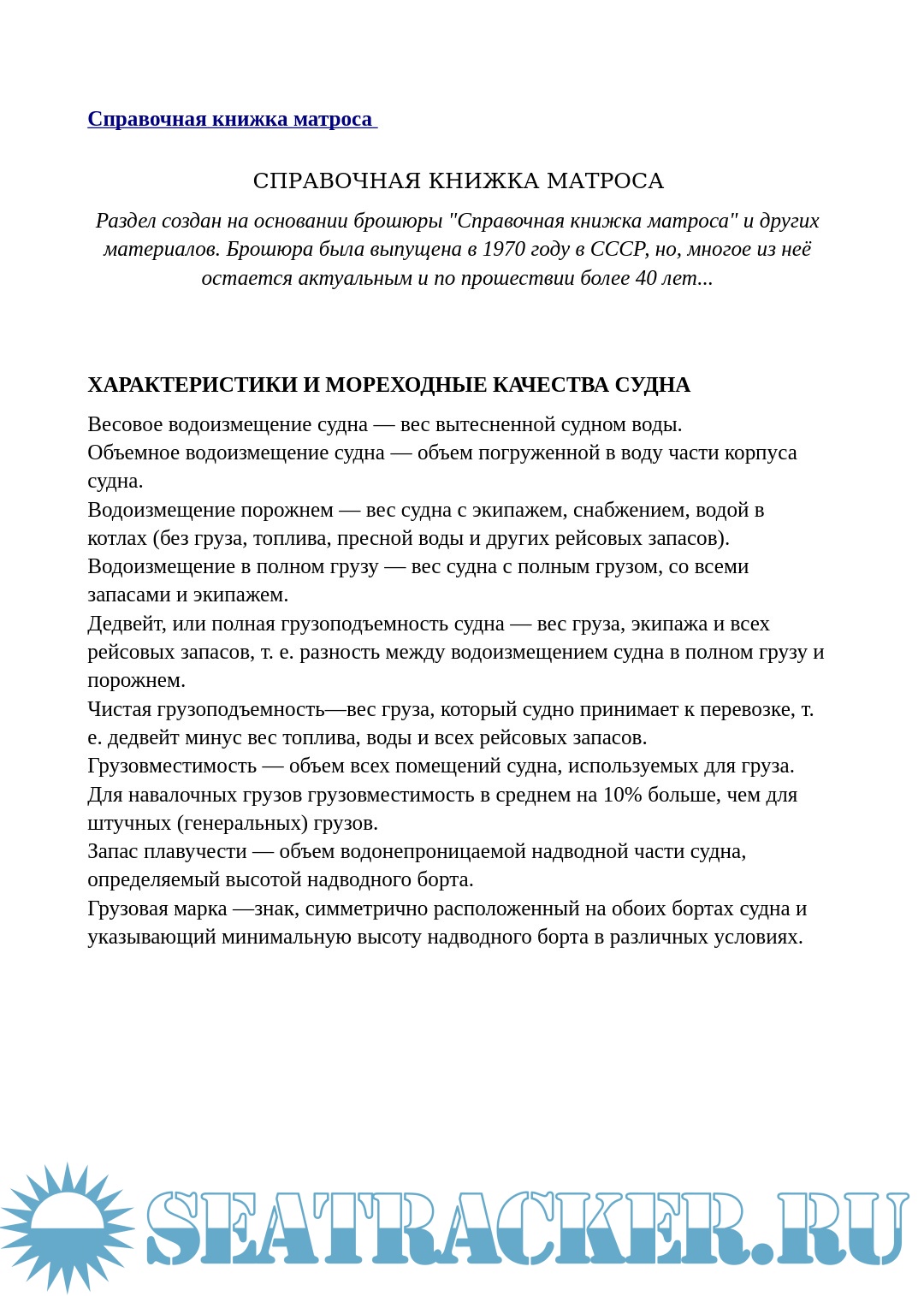Описание: Раздел создан на основании брошюры "Справочная книжка матроса" и других материалов. Брошюра была выпущена в 1970 году в СССР, но, многое из неё