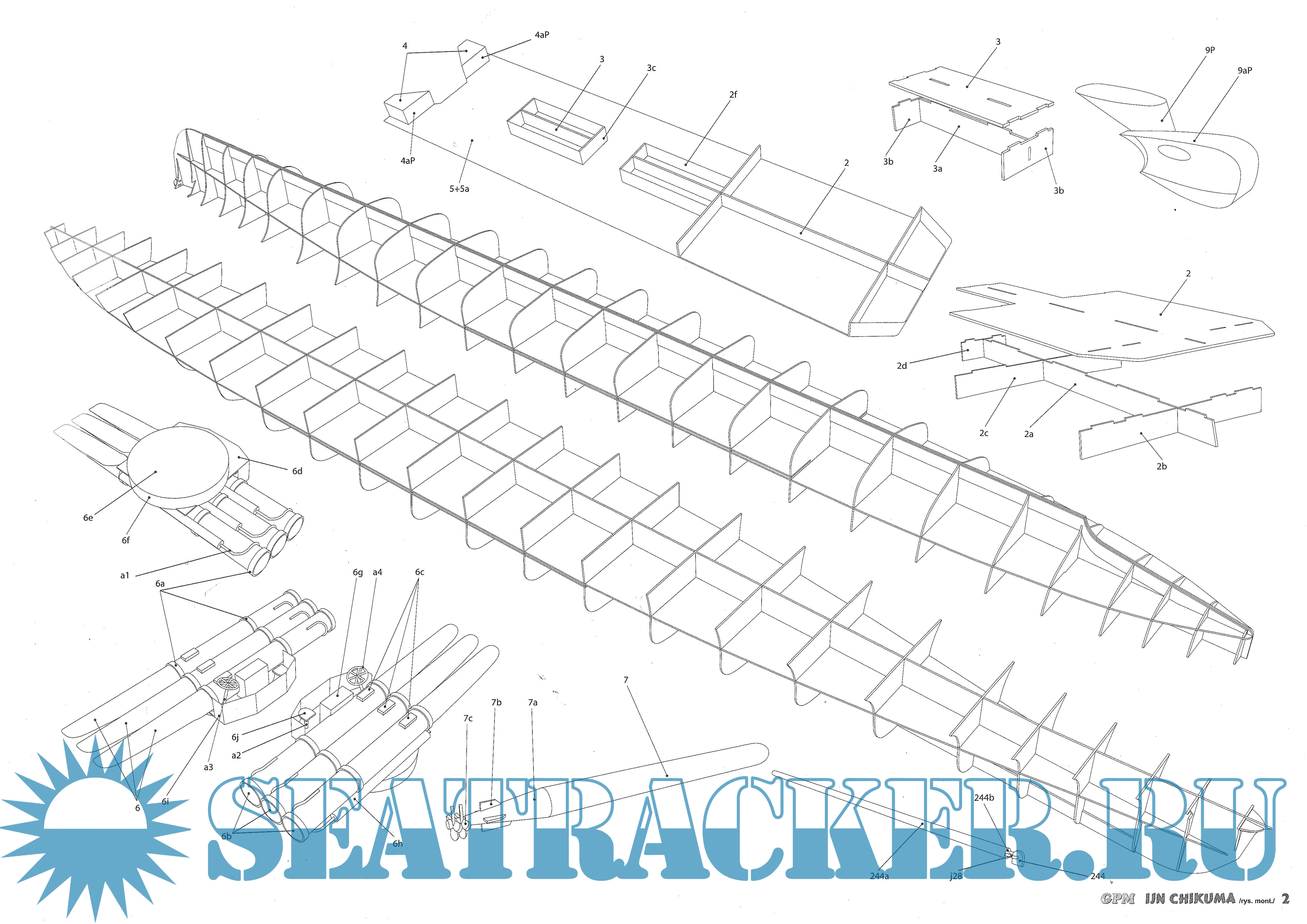 Описание: 42 листа цветных выкроек и инструкций для изготовления бумажной модели японского крейсера IJN Chikuma в масштабе 1:200