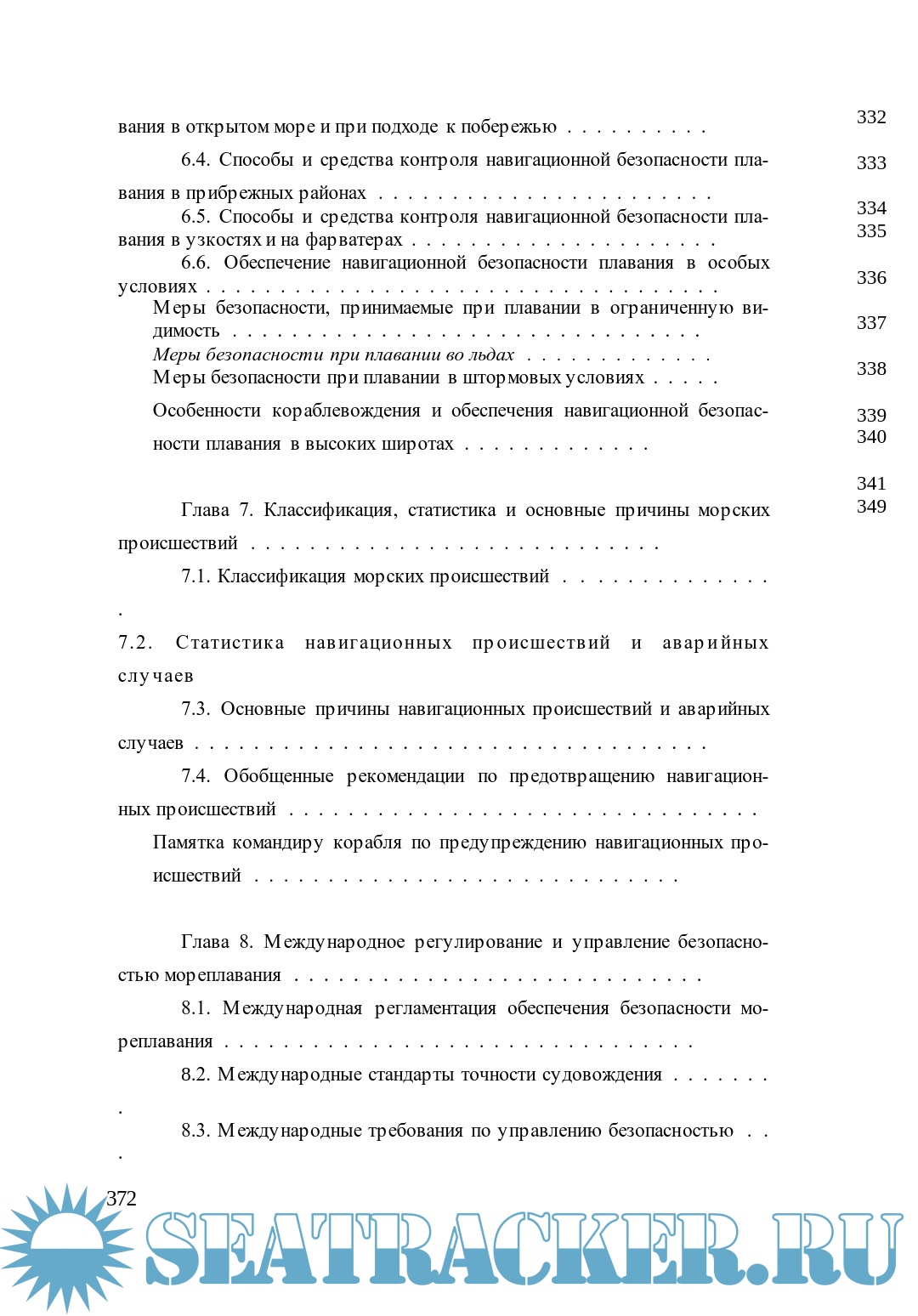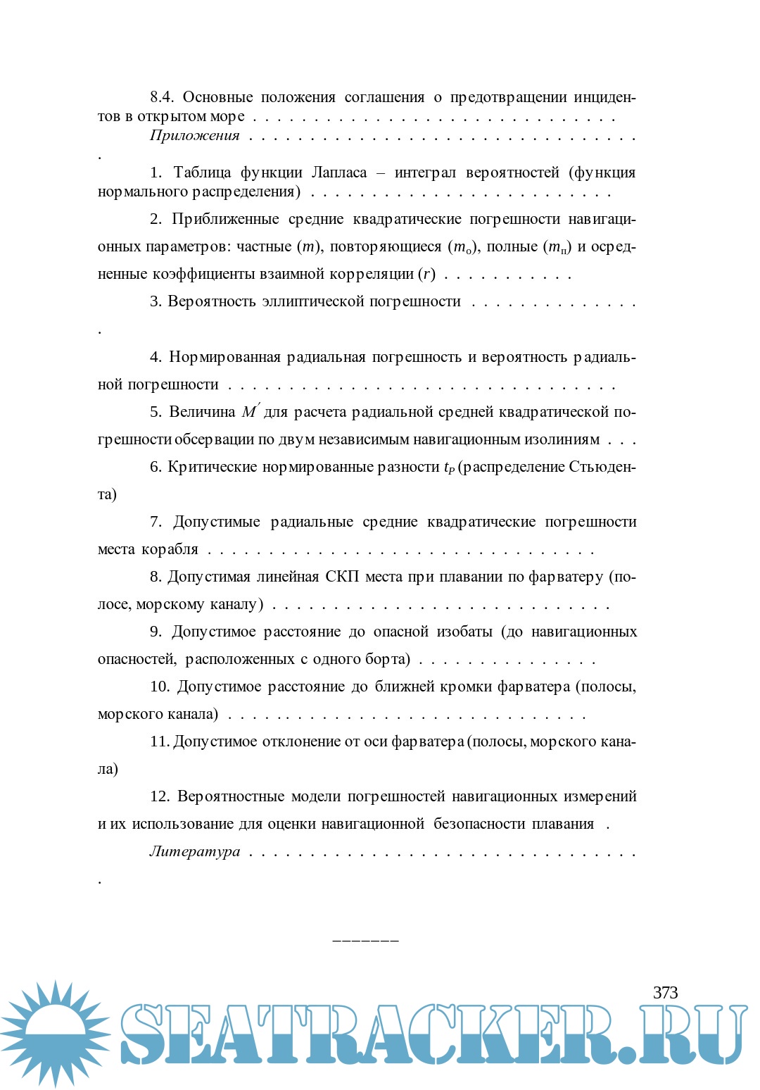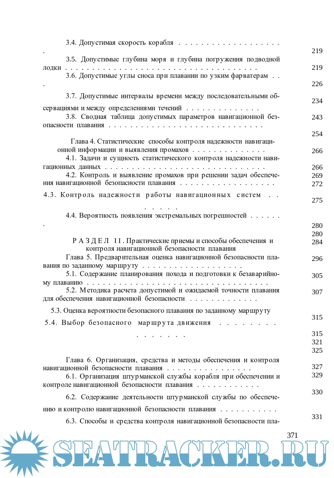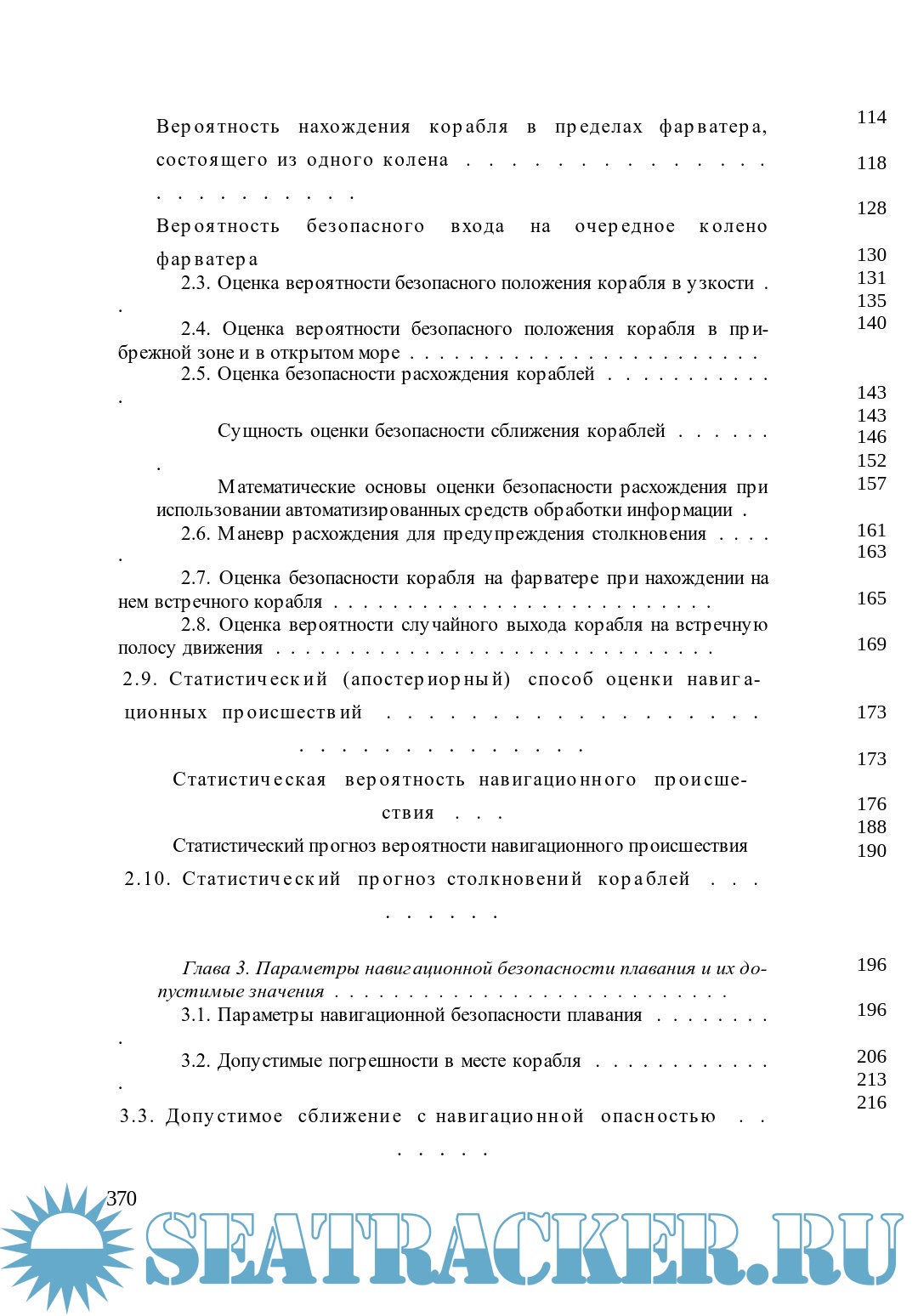 Год выпуска: 2002 Язык: Русский Автор: Груздев Н.М. Жанр: Учебное пособие Издательство: Высшие специальные офицерские классы Военно-морского флота Формат: PDF Качество: Изначально компьютерное (eBook) Количество страниц: 369 Описание: Введение. Обоснование способов оценки точности места и навигационной безопасности плавания. Точностные факторы навигационной безопасности плавания и их оценка. Навигационная безопасность плавания и ее показатель. Погрешности навигационных величин и способы их оценки. Погрешности места корабля и их вероятностная оценка. Оценка точности обсервации, полученной по двум навигационным изолиниям (линиям положения). Оценка точности вероятнейшего места, полученного по трем и более навигационным изолиниям. Погрешность счислимого места и вероятностная оценка точности счисления. Оценка погрешности места корабля по заданному направлению. Количественная оценка навигационной безопасности плавания. Вероятностная модель априорной интегрированной оценки навигационной безопасности плавания. Оценка вероятности безопасного положения корабля в узкости. Оценка вероятности безопасного положения корабля в прибрежной зоне и в открытом море. Оценка безопасности расхождения кораблей. Маневр расхождения для предупреждения столкновения. Оценка безопасности корабля на фарватере при нахождении на нем встречного корабля. Оценка вероятности случайного выхода корабля на встречную полосу движения. Статистический (апостериорный) способ оценки навигационных происшествий. Параметры навигационной безопасности плавания и их допустимые значения. Параметры навигационной безопасности плавания. Допустимые погрешности в месте корабля. Допустимое сближение с навигационной опасностью. Допустимая скорость корабля. Допустимые глубина моря и глубина погружения подводной лодки. Допустимые углы сноса при плавании по узким фарватерам. Допустимые интервалы времени между последовательными обсервациями и между определениями течений. Сводная таблица допустимых параметров навигационной безопасности плавания. Статистические способы контроля надежности навигационной информации и выявления промахов. Задачи и сущность статистического контроля надежности навигационных данных. Контроль и выявление промахов при решении задач обеспечения навигационной безопасности плавания. Контроль надежности работы навигационных систем. Вероятность появления экстремальных погрешностей. Практические приемы и способы обеспечения и контроля навигационной безопасности плавания. Предварительная оценка навигационной безопасности плавания по заданному маршруту. Содержание планирования похода и подготовки к безаварийному плаванию. Методика расчета допустимой и ожидаемой точности плавания для обеспечения навигационной безопасности. Оценка вероятности безопасного плавания по заданному маршруту. Выбор безопасного маршрута движения. Организация, средства и методы обеспечения и контроля навигационной безопасности плавания. Организация штурманской службы корабля при обеспечении и контроле навигационной безопасности плавания. Содержание деятельности штурманской службы по обеспечению и контролю навигационной безопасности плавания. Способы и средства контроля навигационной безопасности плавания в открытом море и при подходе к 