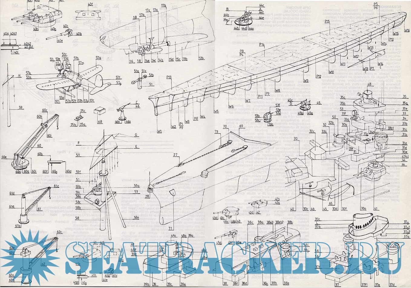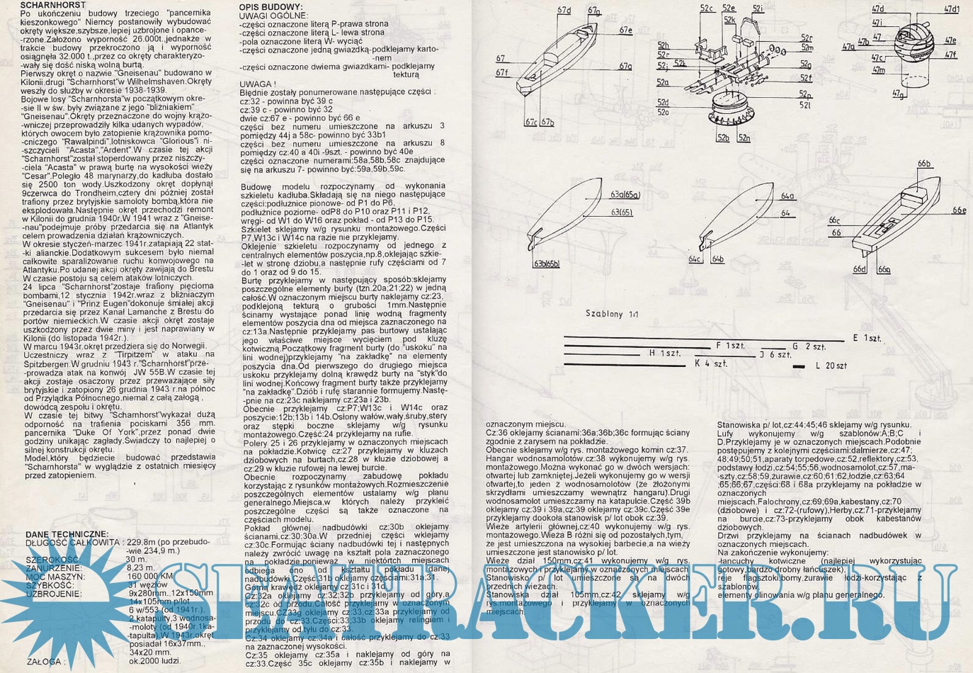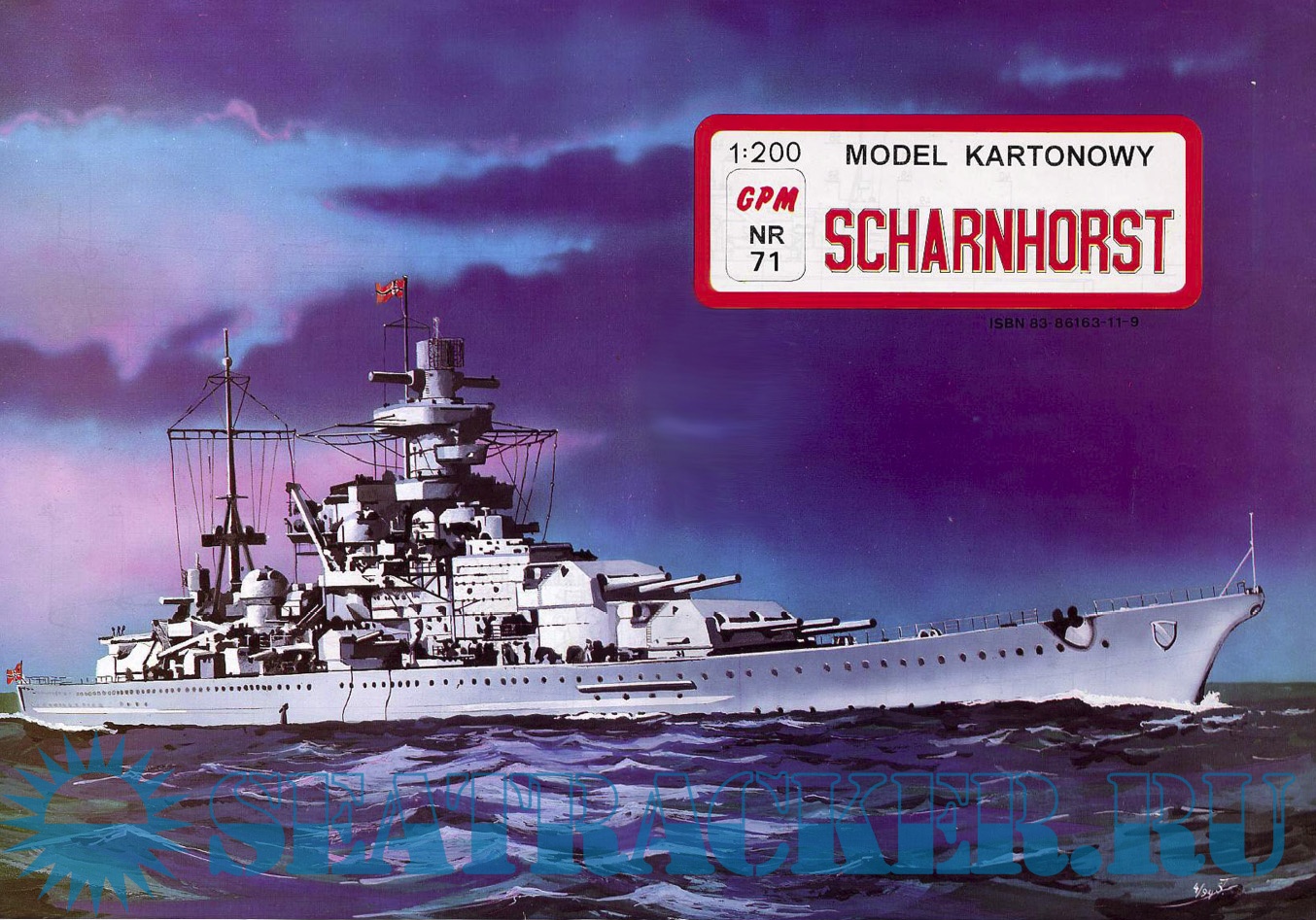 18 листов цветных выкроек и инструкций для изготовления бумажной модели немецкого крейсера Scharnhorst в масштабе 1:200