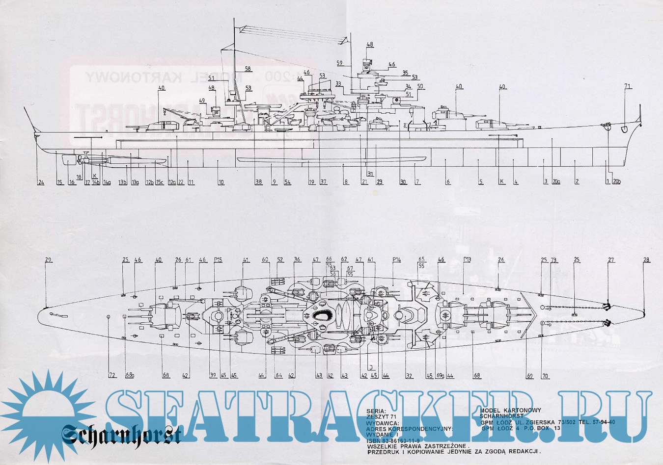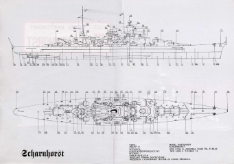 Описание: 18 листов цветных выкроек и инструкций для изготовления бумажной модели немецкого крейсера Scharnhorst в масштабе 1:200