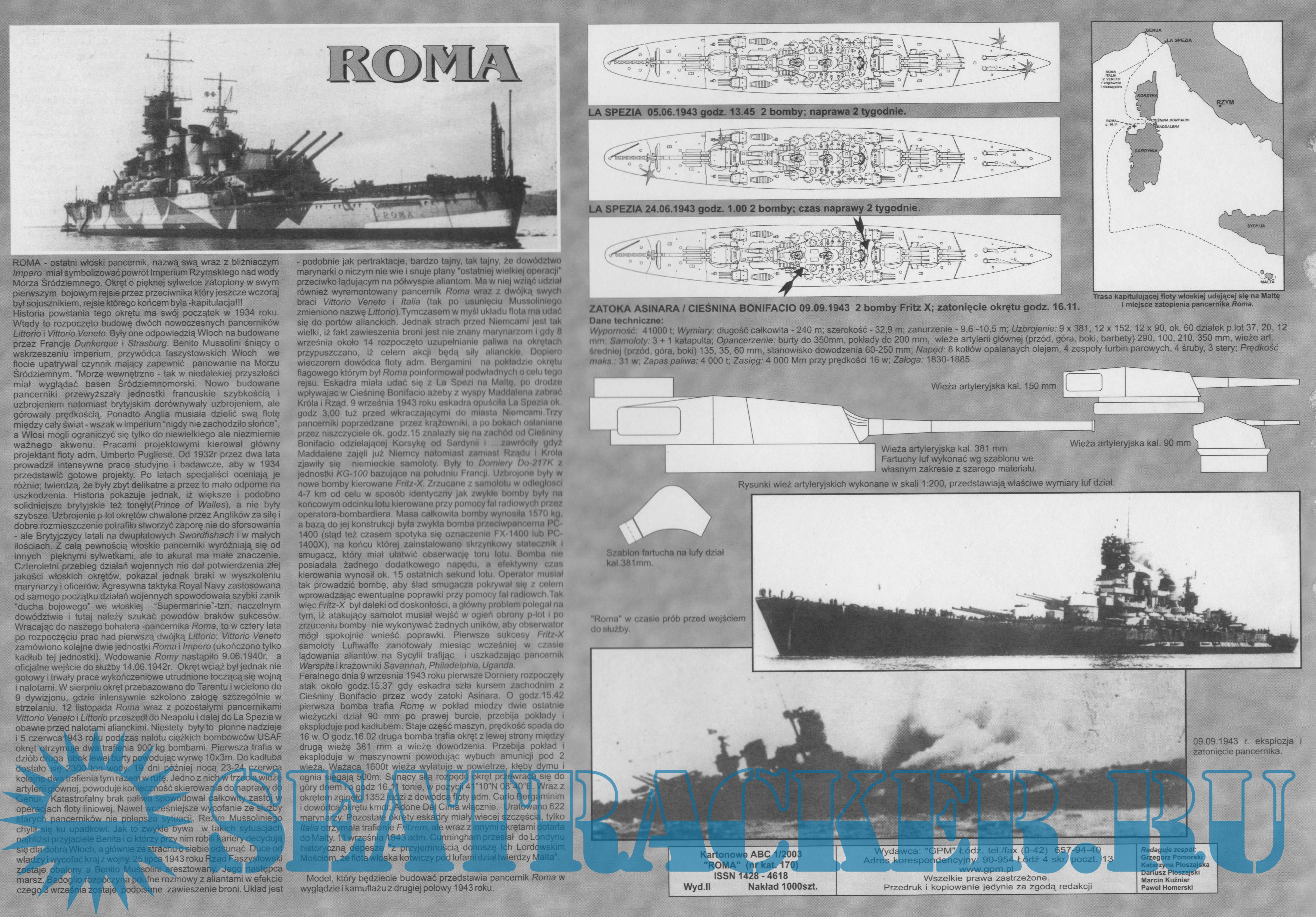 Год выпуска: 2003 Язык: Русский, Польский Автор: нет данных Жанр: Кто действительно занимается судо- (и не только) моделизмом :) Издание: GPM 170 Формат: DOC, JPEG Качество: Изначально компьютерное (eBook) Количество страниц: 28 Описание: 28 листов цветных выкроек и инструкций для изготовления бумажной модели итальянского линкора ''Roma'' в масштабе 1:200