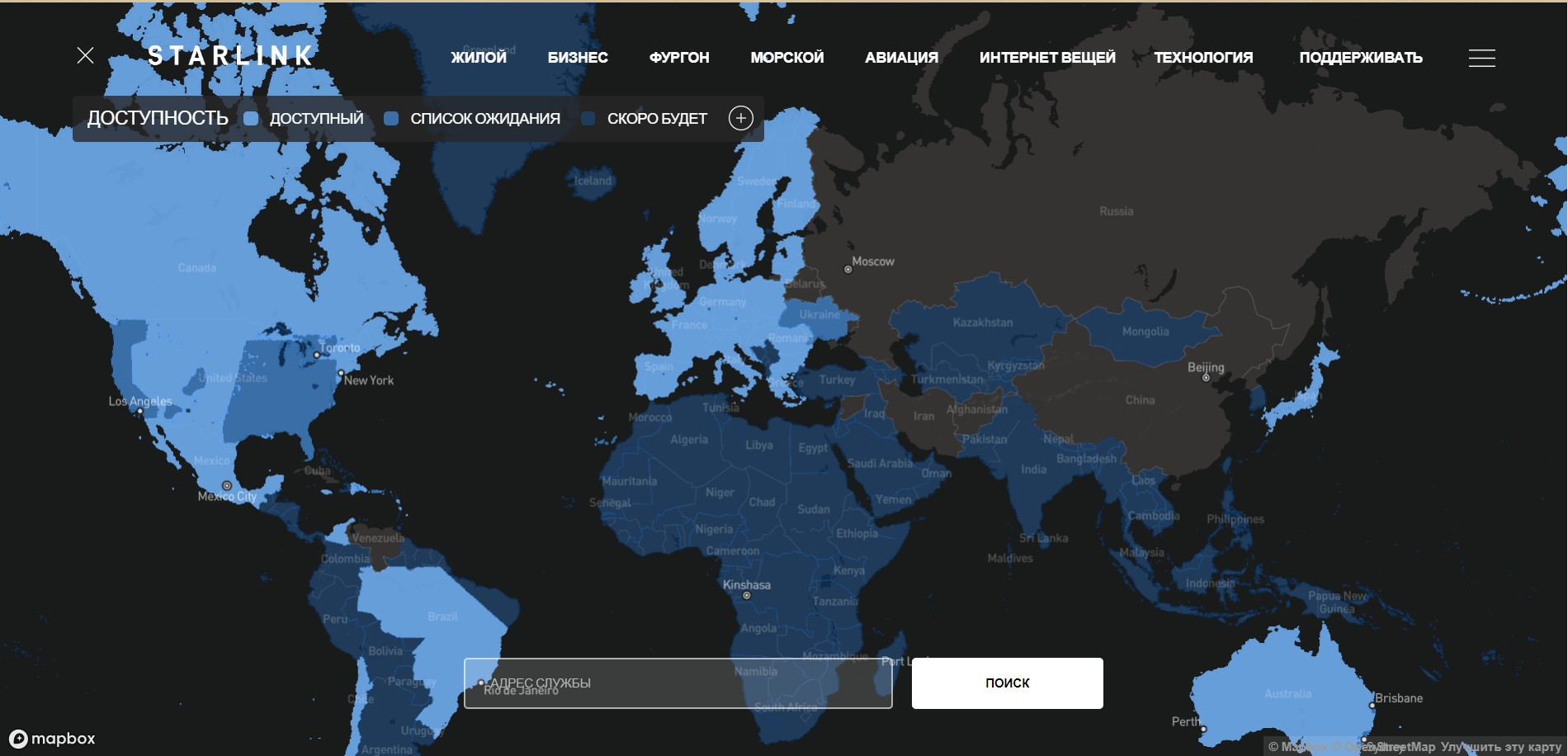 из практики использования - карта на сайте старлинка отстаёт от реальности, множество портов в той же африке с устойчивым соединением на карте вообще в тёмной зоне.