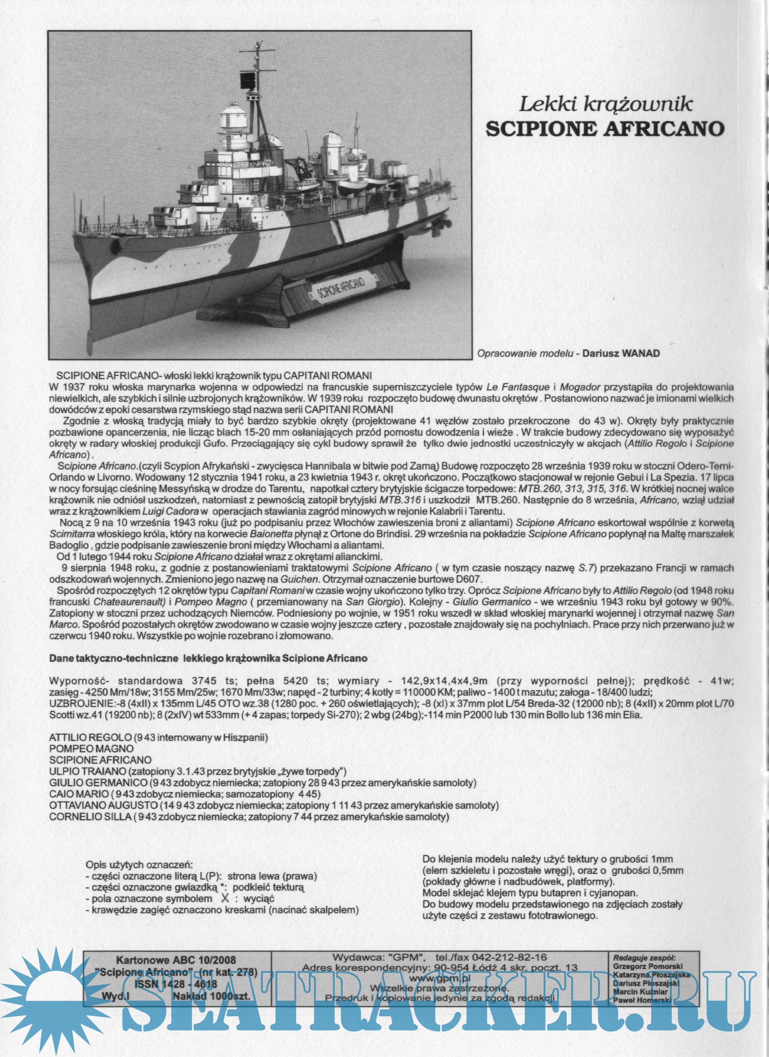 29 листов цветных выкроек и инструкций для изготовления бумажной модели французского лёгкого крейсера Scipione Africanoв масштабе 1:200