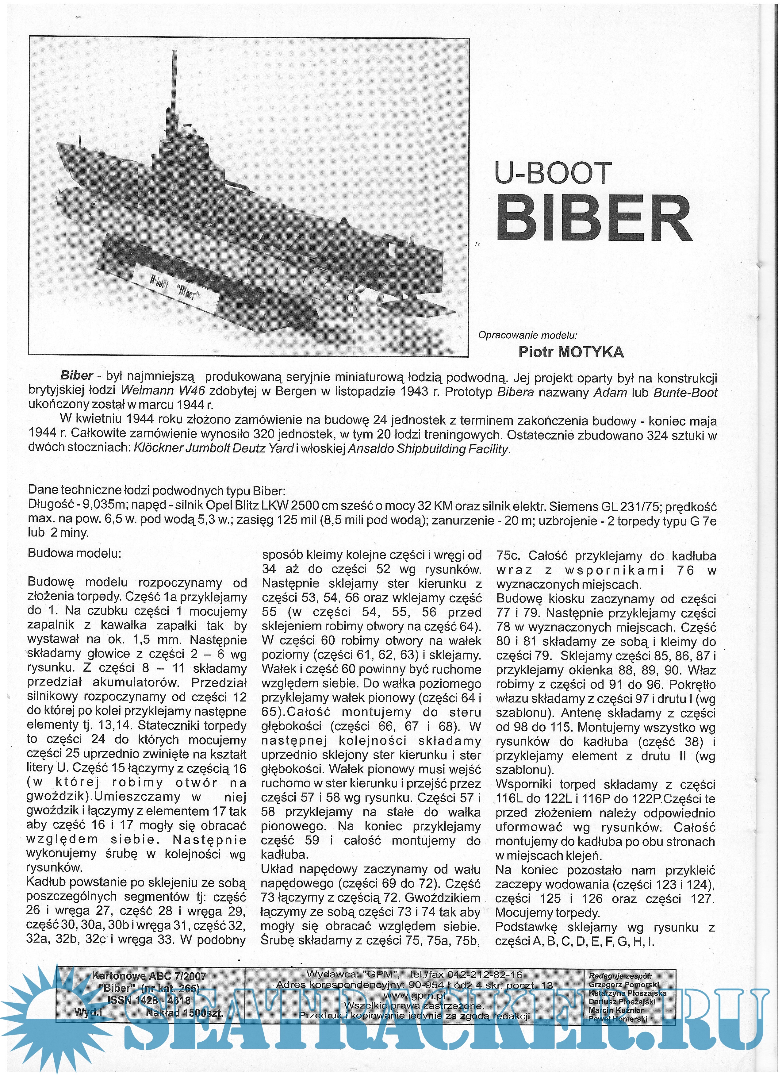 Описание: 12 листов цветных выкроек и инструкций для изготовления бумажной модели германской подводной лодки BIBER в масштабе 1:25