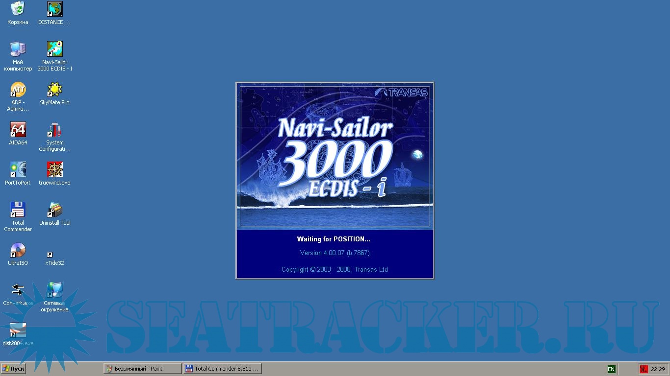Год выпуска: 2009 Разработчик: Transas Совместимость с Vista: yes Системные требования: Для виртуальной машины надо 1.5гб оперативы и около 30гб места на диске Язык интерфейса: английский + русский Таблэтка: Не требуется Описание: Полностью рабочая виртуальная машина с Transas navi-sailor 3000 на базе WinXP SP3. Установлены карты WF40 (вроде бы, номер не помню) у которых лицензия до осени 2009 года. Машину создавал сам, пользовался ей в рейсе - работоспособна на все 100%. Подключался через AIS Pilot Plug и USB порт. Самое главное - после запуска ОС откатываем дату на лето 2009 года. Затем запускаем TotalCommander: в левом окне 2 раза нажимаем на SP.EXE; в правом окне по очереди двумя щелчками запускаем sentemu.bat sentemu_of.bat SENTEMU.exe. Закрываем коммандер и запускаем нави-сейлор!