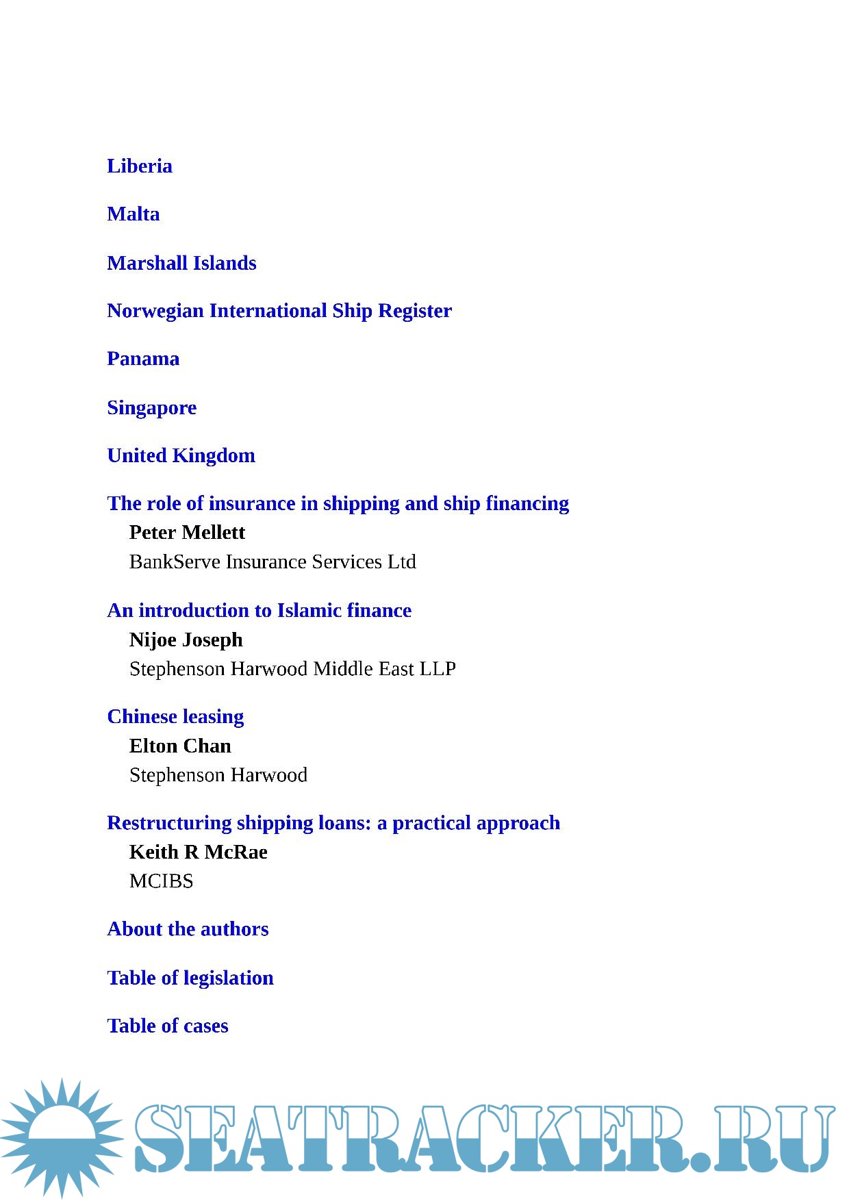 In addition, Shipping Finance provides an extensive discussion of the procedure and documentation for registering ships on a country-by-country basis, with detailed advice from local experts.