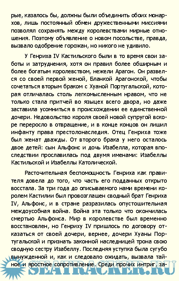 Год выпуска: 1985 Язык: Русский Автор: Ф. Купер. Жанр: Художественная литература Издательство: Одесса. Маяк Издание: Морская библиотека Формат: FB2 Качество: Изначально компьютерное (eBook) Количество страниц: 628 Описание: Написанный в 1840 году роман Джеймса Фенимора Купера «Мерседес из Кастилии» входит в «морской» цикл романов писателя. В нём описано первое плавание Христофор Колумба к берегам Америки. События происходят в XV веке, когда Испанией совместно правили Фердинанд и Изабелла после объединения двух королевств — Арагона и Кастилии. Это было время мрачной церковной инквизиции во главе с Торквемадой, когда преследовалось любое инакомыслие, из страны изгонялись евреи и мавры, по обвинению в ереси людей заживо сжигали на кострах. Тем не менее, Изабелла и Фердинанд выделили необходимые средства на экспедицию Христофора Колумба в поисках нового пути в Индию и Китай (в названии книги отражено его старое название Катай (англ. Cathay)) в надежде на хорошую прибыль в будущем. Никто тогда не мог предполагать, что вместо этого Колумб откроет Новый Свет. Главная героиня романа — маркиза Мерседес де Вальверде. В неё влюблён молодой граф Луис де Бобадилья, известный своей ветреностью и легкомыслием. Чтобы добиться руки своей возлюбленной и исправить свою репутацию, Луис решает принять участие в экспедиции Христофора Колумба. В пути мореплавателей поджидают опасности и приключения. Во время путешествия в Луиса влюбляется индейская девушка Озэма с острова Гаити. Молодому человеку предстоит сделать непростой выбор между двумя любимыми женщинами.