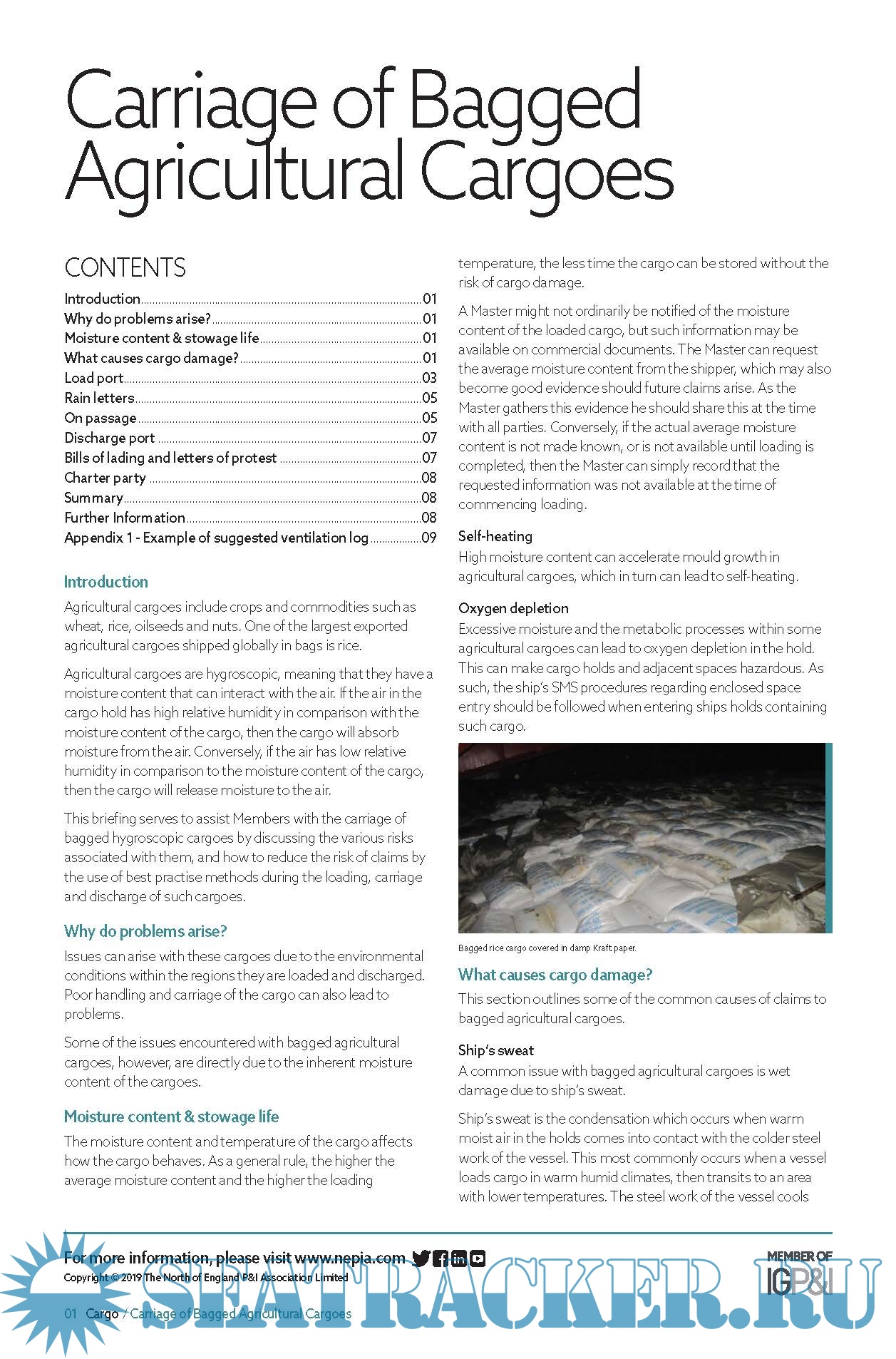 Year: 2019 Language: english Author: the North Genre: Practical guide Format: PDF Quality: eBook Pages count: 10 Description: Agricultural cargoes include crops and commodities such as wheat, rice, oilseeds and nuts. One of the largest exported agricultural cargoes shipped globally in bags is rice. This briefing serves to assist Members with the carriage of bagged hygroscopic cargoes by discussing the various risks associated with them, and how to reduce the risk of claims by the use of best practise methods during the loading, carriage and discharge of such cargoes.