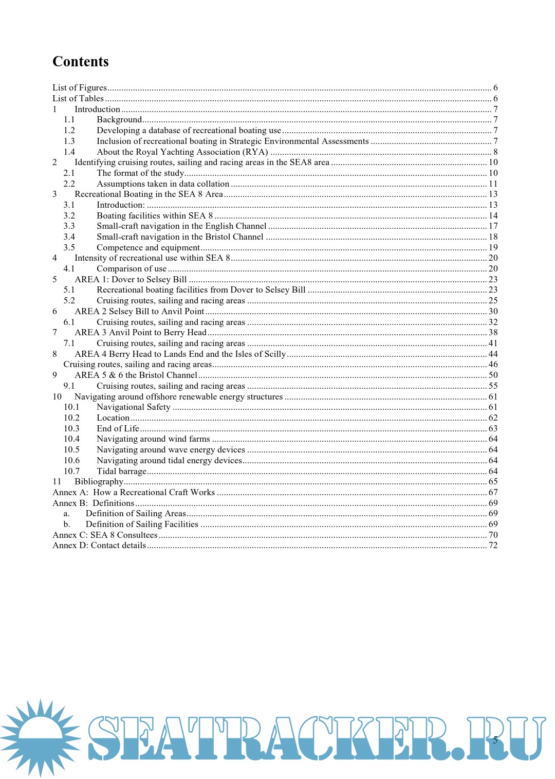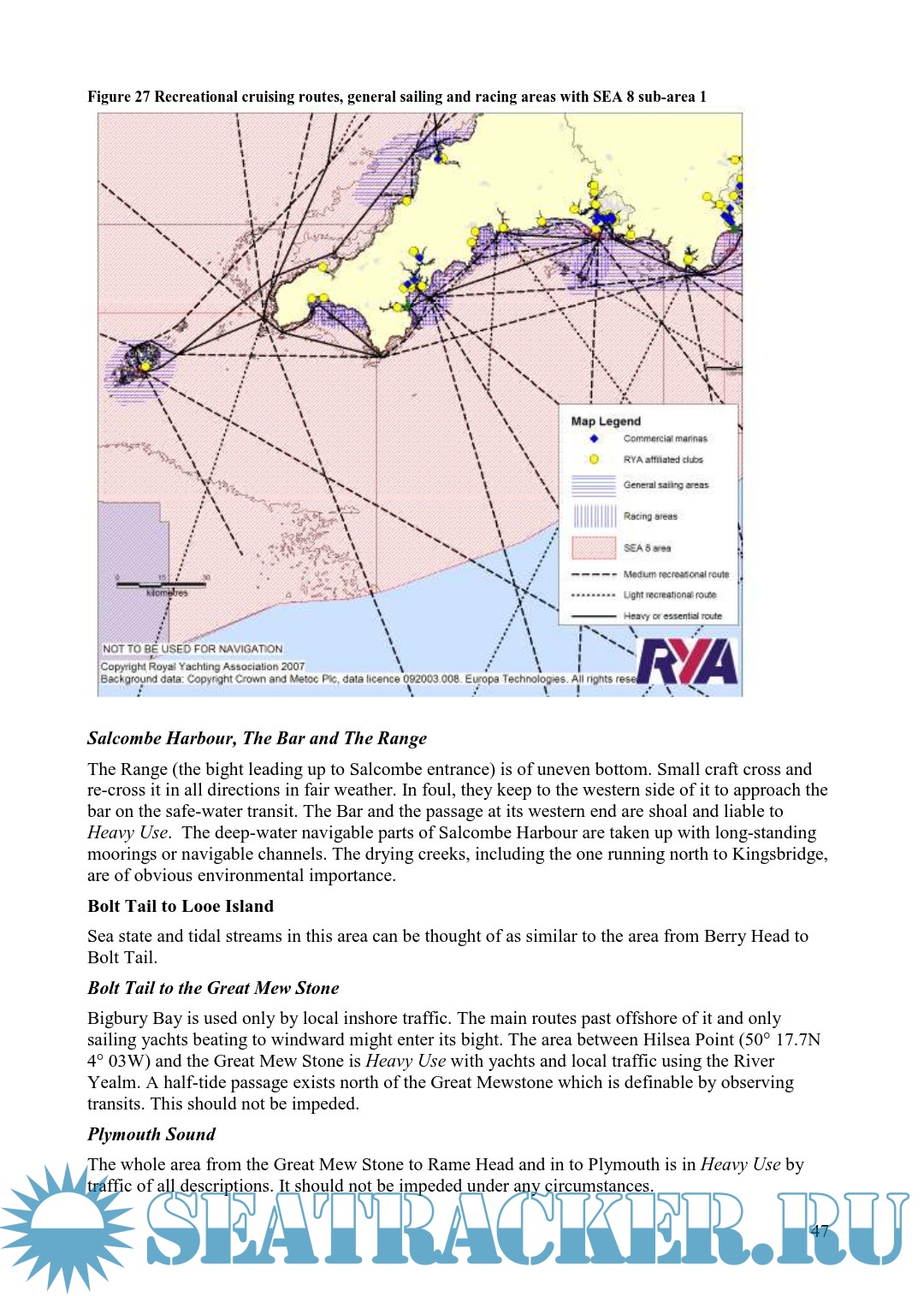 Description: The SEA 8 project has been undertaken by the RYA. This has involved the coordination and collation of data within the SEA 8 area and input and revision of the RYA’s geographical information system. The routes are plotted as straight lines. However, recreational sailing craft rarely operate in straight lines. Their direction of travel is dictated by the direction of wind. This is explained in detail in Annex A. this report also contains a section in Chapter 9 that describes some of the difficulties that may be faced in navigating around some of the different offshore renewable energy structures.
