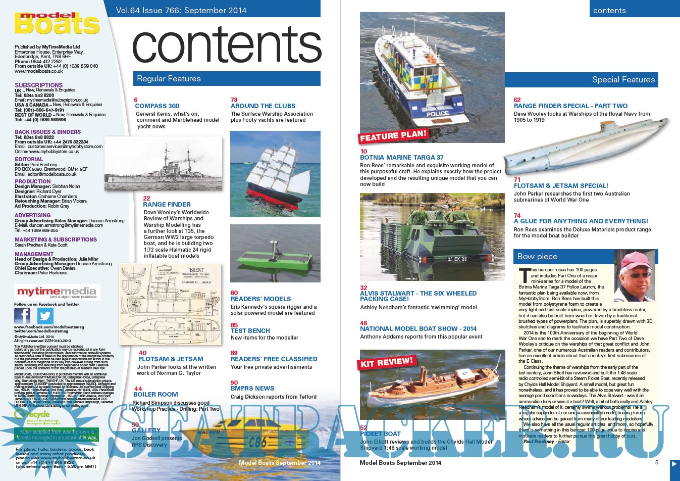 Description: Model Boats magazine is a practical and informative read for those with a love for the hobby. It covers the latest news and views from the various clubs and associations around the country, useful hints, tips and step by step guides for those interested in the art of constructing a model boat as well as tests and recommendations of new boats and tools. Floating along behind these are great special features examining in depth different models from narrowboat to destroyer!