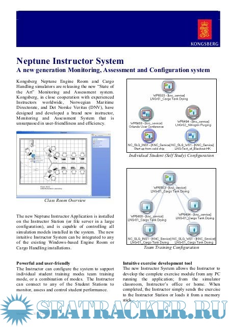 Year: 2012 Version: 2.4.0.0258 Developer: Kongsberg Platform: Windows Localization: english Crack: N/A Description: Kongsberg Maritime, a world leading supplier of maritime simulation systems has introduced a next generation monitoring, assessment and configuration tool for its Neptune Engine Room and Cargo Handling simulators. The Neptune Instructor System has been designed to enhance the quality of simulation training by providing complete, user-friendly control of student exercises. The Neptune Instructor System enables the instructor to develop bespoke exercise modules for individuals, teams or a combination of both from any PC running the application. Using an advanced but intuitive suite of tools, instructor created exercise modules may comprise any of the following components: * Initial Condition - describes all the variables at the start of the exercise * Triggers - a combination of events that initiate an Action, e-Coach message or Assessment * Actions - derived from Input Variables and Malfunctions, which can be initiated instantaneously, or pre-programmed as part of the exercise * E-Coach Messages - built in, bespoke and automatic student mentoring and performance feedback system * Student Station Configuration - define what information is accessible and visible to students * Assessment - monitor and assess alarms, and any of 6,000 variables in the simulation models A key aspect of the Neptune Instructor System is its integrated recording and playback functionality. Recording of all activity during the simulation exercise takes place automatically and review/debriefing can include the replay of parts of, or the entire exercise in order to focus on specific learning objectives. Kongsberg Maritime's simulation developers have also introduced an innovative new 'resume' functionality, which enables an exercise to be stopped and started at will. If a student begins to have problems or fails in a particular operation, the instructor can pause the simulation to give guidance or advice, and then resume the exercise. The instructor can also go back to any earlier point in time, and restart from there. Note: Not Crack yet. If anyone can crack this app please share. Password seatracker@14qjrv080190