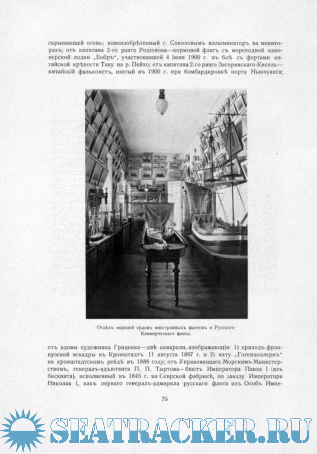 Описание: В числе различных, по своим специальностям, , музеев, находящмхсы в С.-Петербурге, имеется в здании Главного Адмиралтейсива Морской Музей, в котором историческая часть русского флота не только занимает почётное местол, с моделью знаменитого "Дедушки", но где в моделях и образцах с математической точностью, изображаются и существующие типы судов, их боевое вооружение и снабжение в хозяйственном отношении.