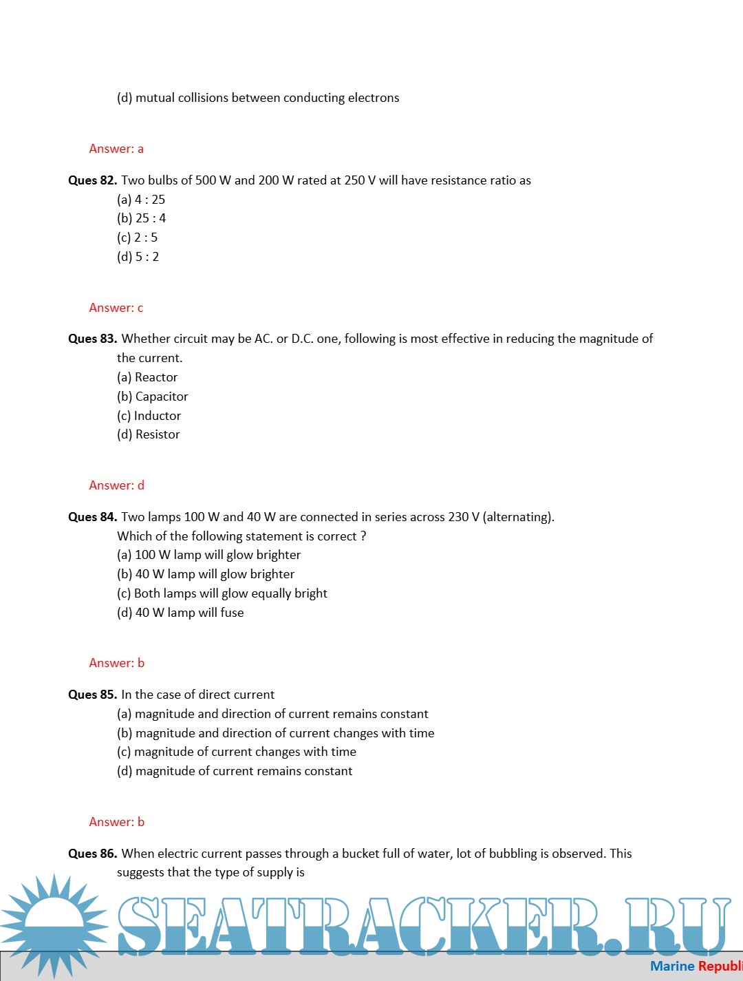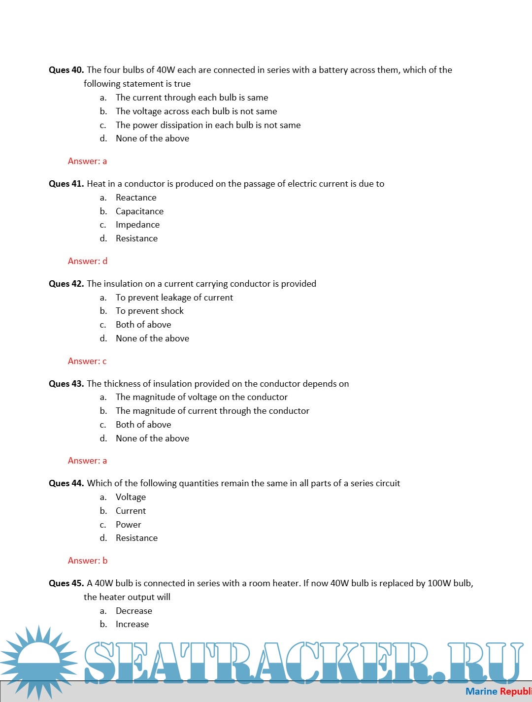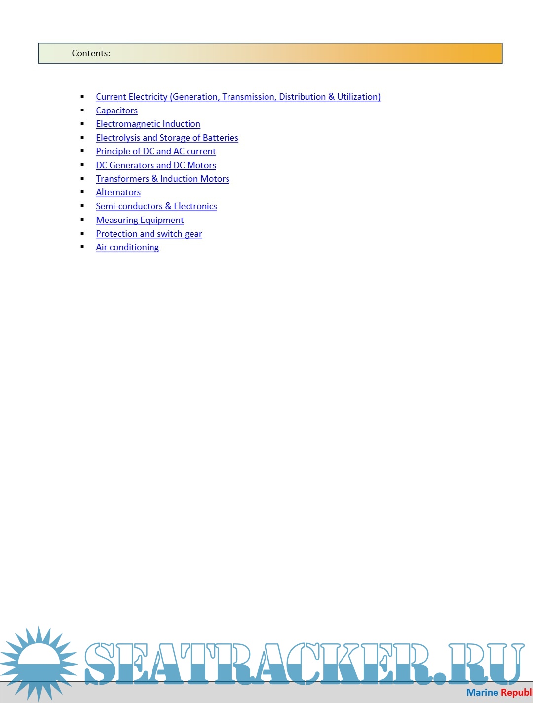 Description: This book is a question-and-answer compendium designed for Electrical Technical Officers (ETO) and marine engineers preparing for exams and assessments. Covering key topics such as current electricity (generation, transmission, distribution, and utilization), capacitors, electromagnetic induction, electrolysis, and battery storage, it provides a structured approach to testing knowledge. The collection also includes questions on DC and AC principles, DC generators and motors, transformers, induction motors, alternators, semiconductors, electronics, measuring equipment, protection and switchgear, and air conditioning. An essential resource for both aspiring and experienced professionals, this questionnaire helps reinforce technical expertise and readiness for real-world applications.