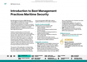Best Management Practices (BMP) for Maritime Security consolidates previously published regional publications into a single, comprehensive publication with actionable insights and advice. It focuses on providing a threat and risk management process and, recognising the dynamic nature of regional security situations, provides signposts to direct users to the most-up-date security intelligence and risk assessment information.