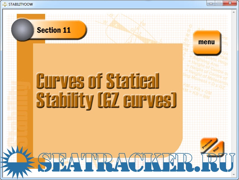 The purpose of including the more advanced material is primarily one of giving the program a suitable ending. To only cover those topics necessary to pass the OOW level examinations would be like writing a book but missing out the last chapter! Sections 16-19 take the learner beyond the scope of the OOW level requirements to allow the learner to be able to complete a full ship load problem using the ship stability data book developed for this purpose. These final sections will be invaluable to anyone preparing themselves for the more advanced Class 2/1 Ship Stability examinations. A second CD- ROM is currently being developed for the higher level Class 2/1 candidate.