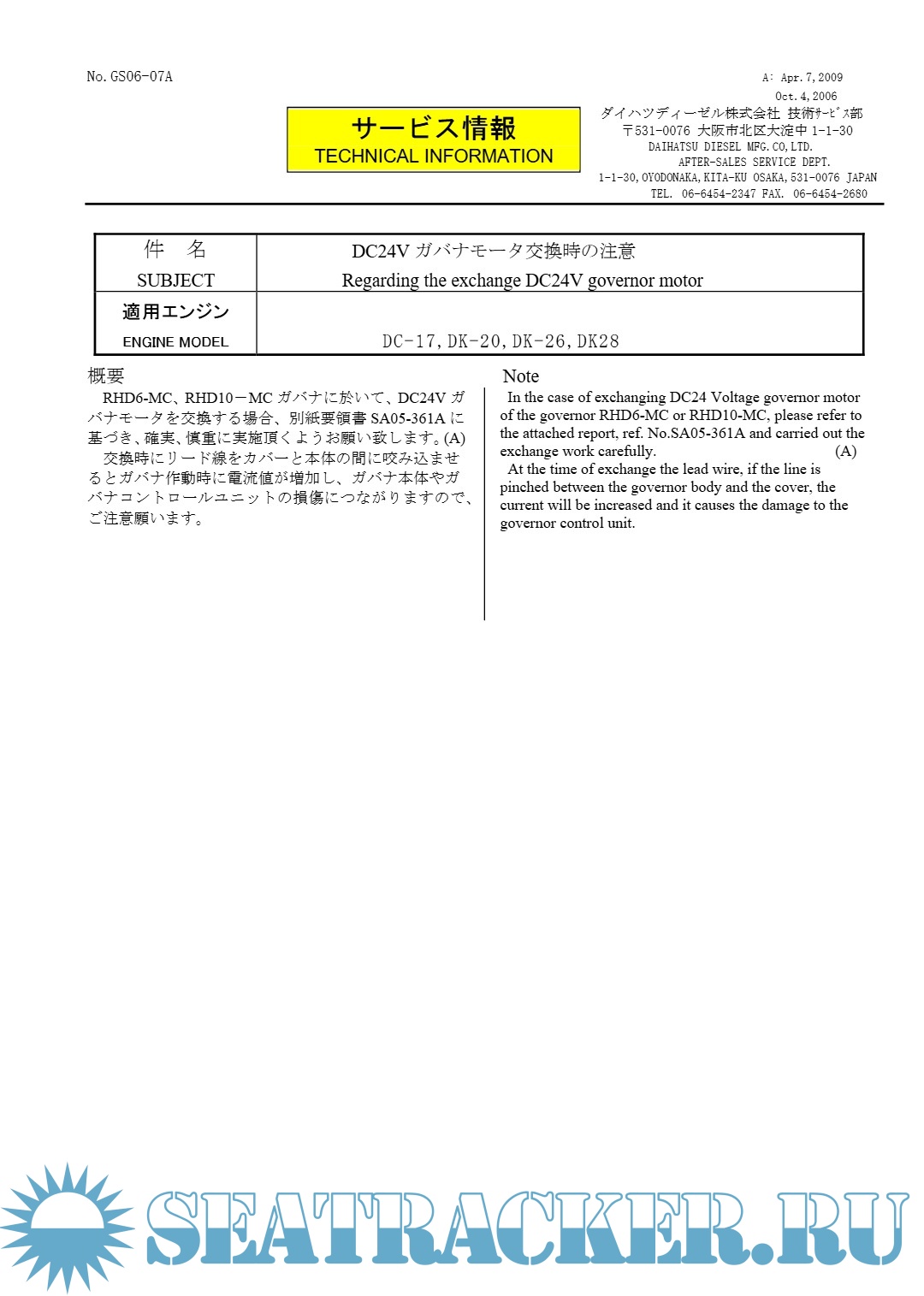 Description: TECHNICAL INFORMATION Regarding the exchange DC24V governor motor. In the case of exchanging DC24 Voltage governor motor of the governor RHD6-MC or RHD10-MC, please refer to the attached report, ref. No.SA05-361A and carried out the exchange work carefully. (A) At the time of exchange the lead wire, if the line is pinched between the governor body and the cover, the