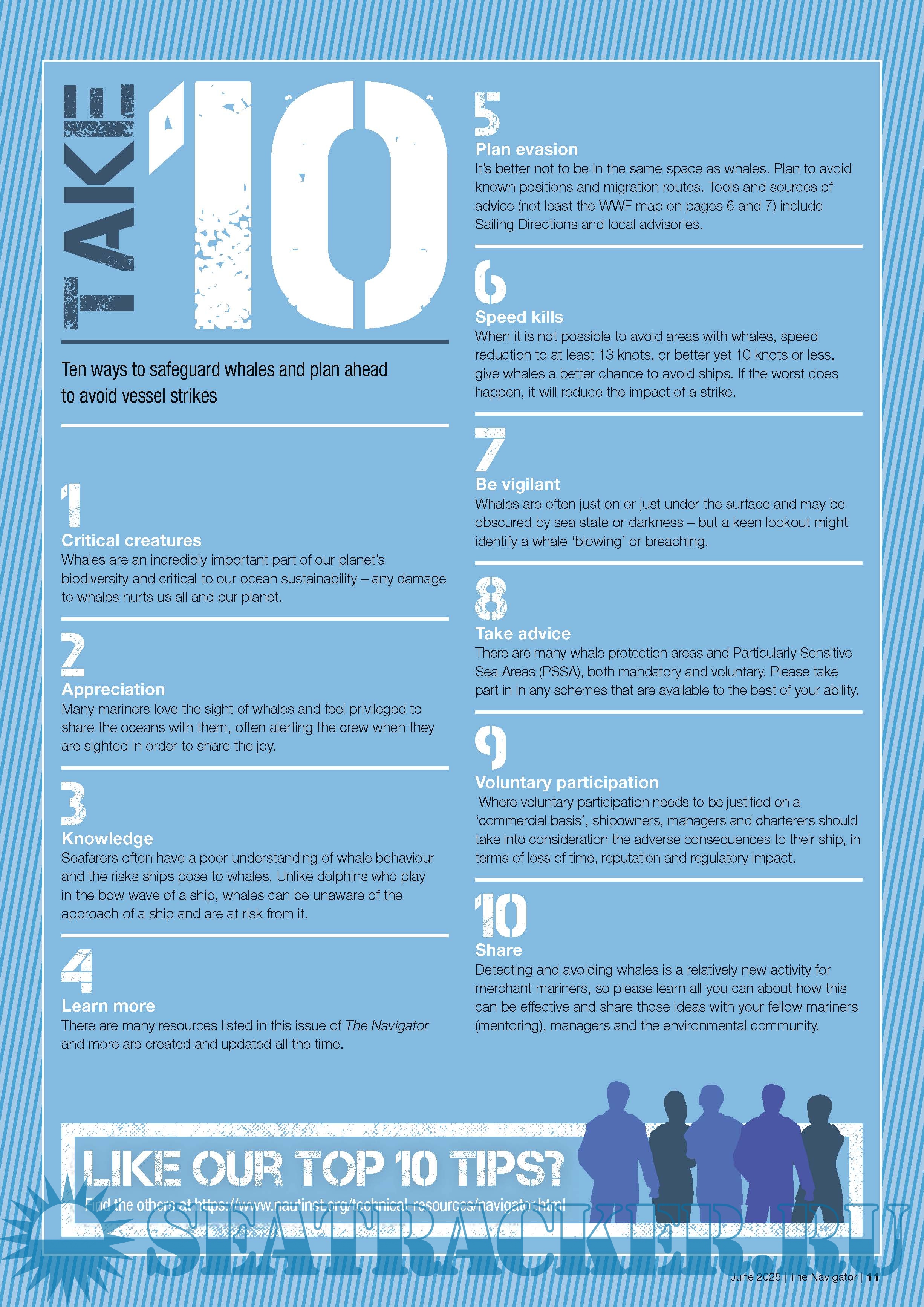 Year: 2025 Language: English Author: Emma Ward (Editor) Genre: Journal, Periodical publication Publisher: The Nautical Institute Edition: Issue no. 39 June, 2025 Format: PDF Quality: eBook Pages count: 12 Description: Inspiring professionalism in marine navigators! The Navigator a publication from The Nautical Institute that champions the role of today's professional marine navigators. Published in association with the Royal Institute of Navigation. In this edition of The Navigator, we focus on detecting, protecting and avoiding whales at sea. Avoiding whale strikes is the collective responsibility of all stakeholders within the shipping industry. According to the IMO and NOAA (National Oceanic and Atmospheric Administration), all sizes and types of ship or vessel, including recreational, commercial and governmental vessels have the potential to collide with nearly all kinds of marine species, including whales. Damage to vessels notwithstanding, the whale will likely come off the worse in the exchange. The increase in the number, size and speed of ships means that the threat of ships striking whale and other marine species is also getting bigger.